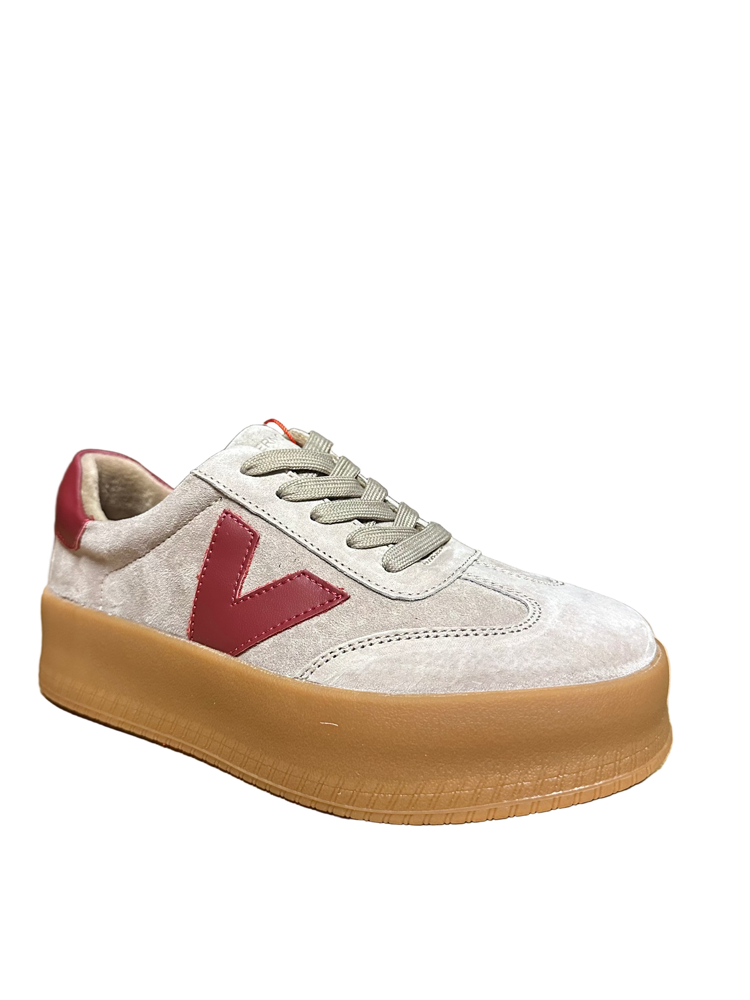Drilleys Womens Eighty Four Trainers in Brick Red. Faux suede leather upper in pale rose red with maroon detailing. Platform gum sole.