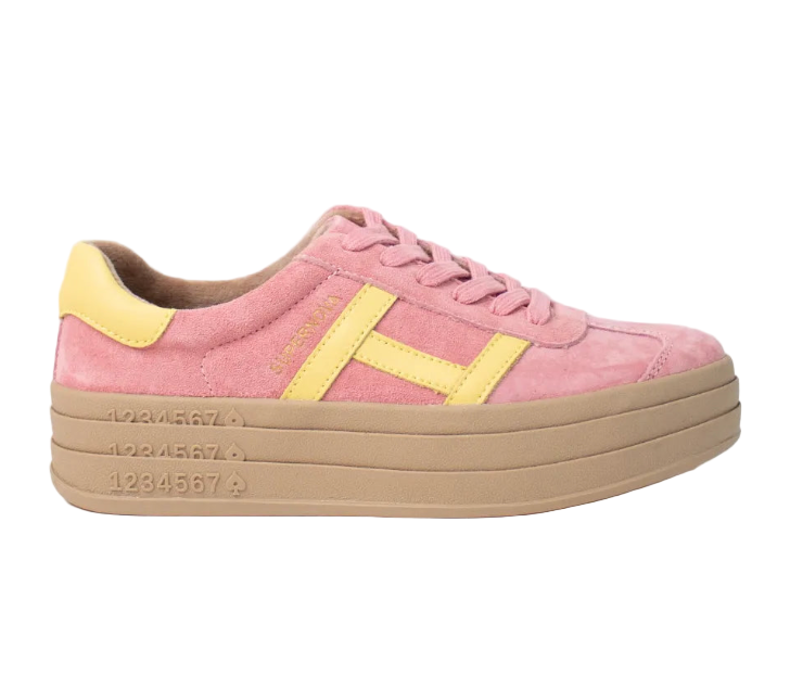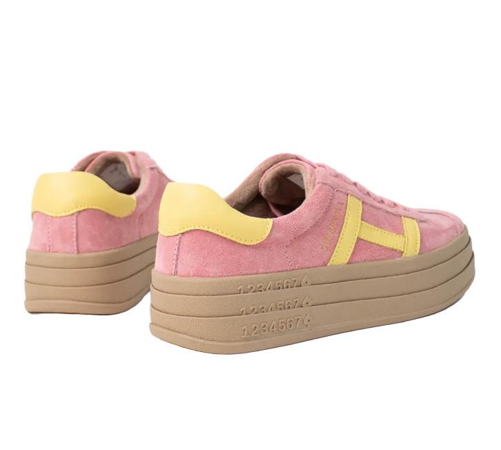 Drilleys Womens Sixty Eight Trainers in Candy Cane Pink. Faux suede leather upper in baby pink with yellow detailing. Layered gum sole.