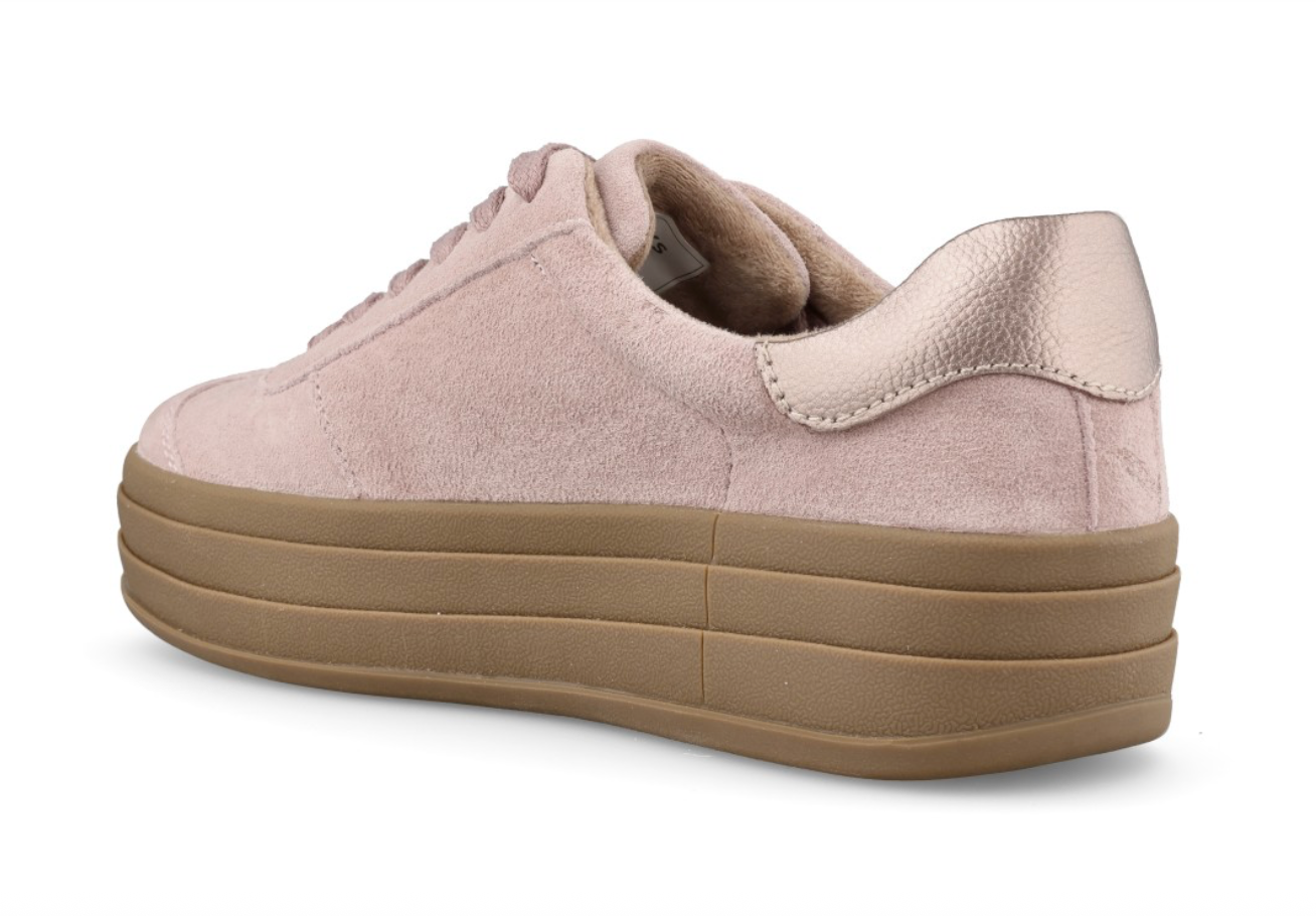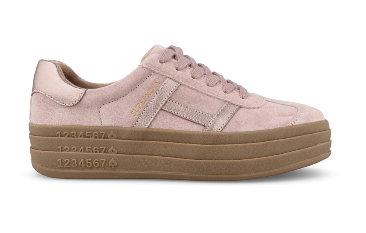 Drilleys Womens Sixty Eight Trainers in Pink Daisy. Faux suede leather upper in dusky pink with rose gold detailing. Layered gum sole.