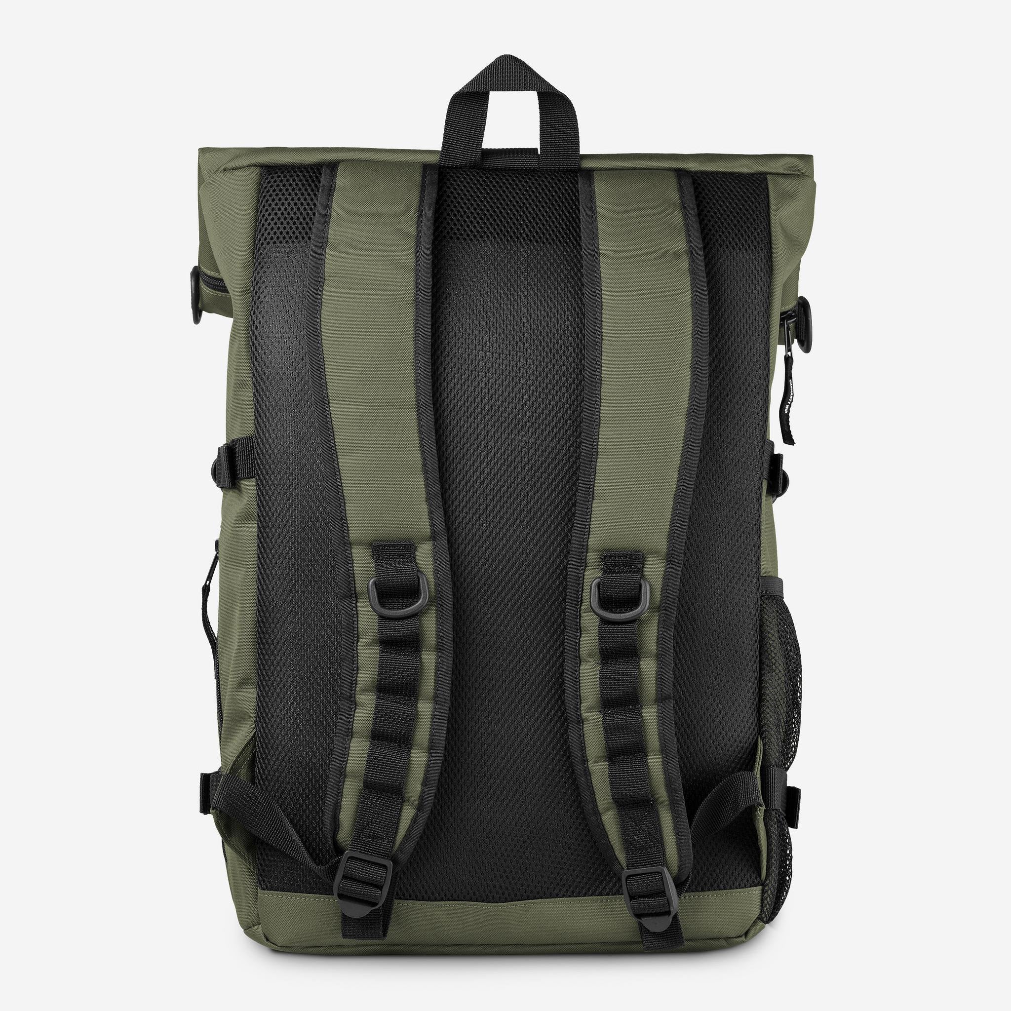 The Carhartt WIP Philis Backpack is an expandable style constructed from water-repellent, recycled polyester canvas. It features an unlined main compartment with a zip and flap closure, a padded inside pocket, and adjustable shoulder straps.
