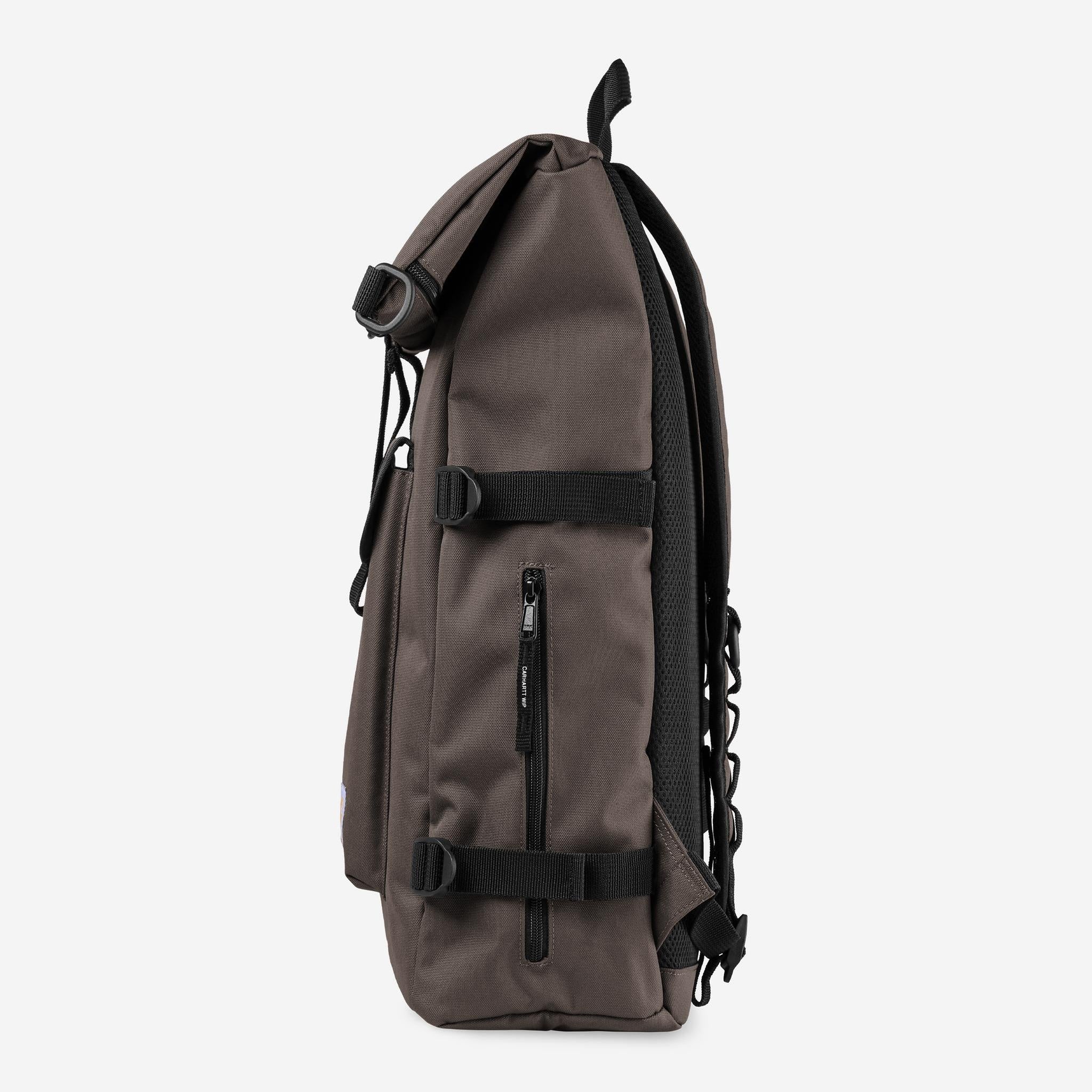 The Carhartt WIP Philis Backpack is an expandable style constructed from water-repellent, recycled polyester canvas. It features an unlined main compartment with a zip and flap closure, a padded inside pocket, and adjustable shoulder straps.