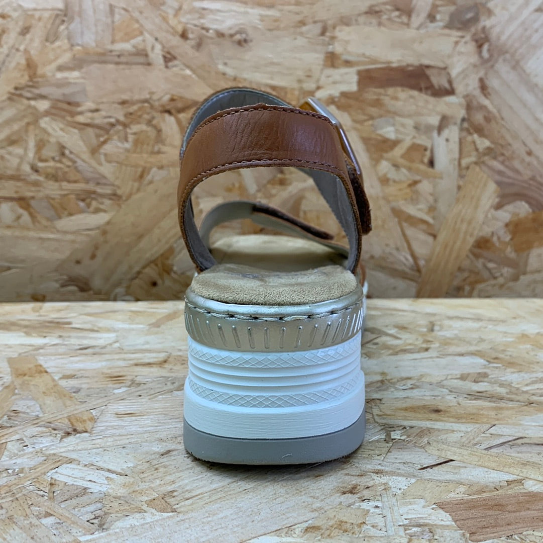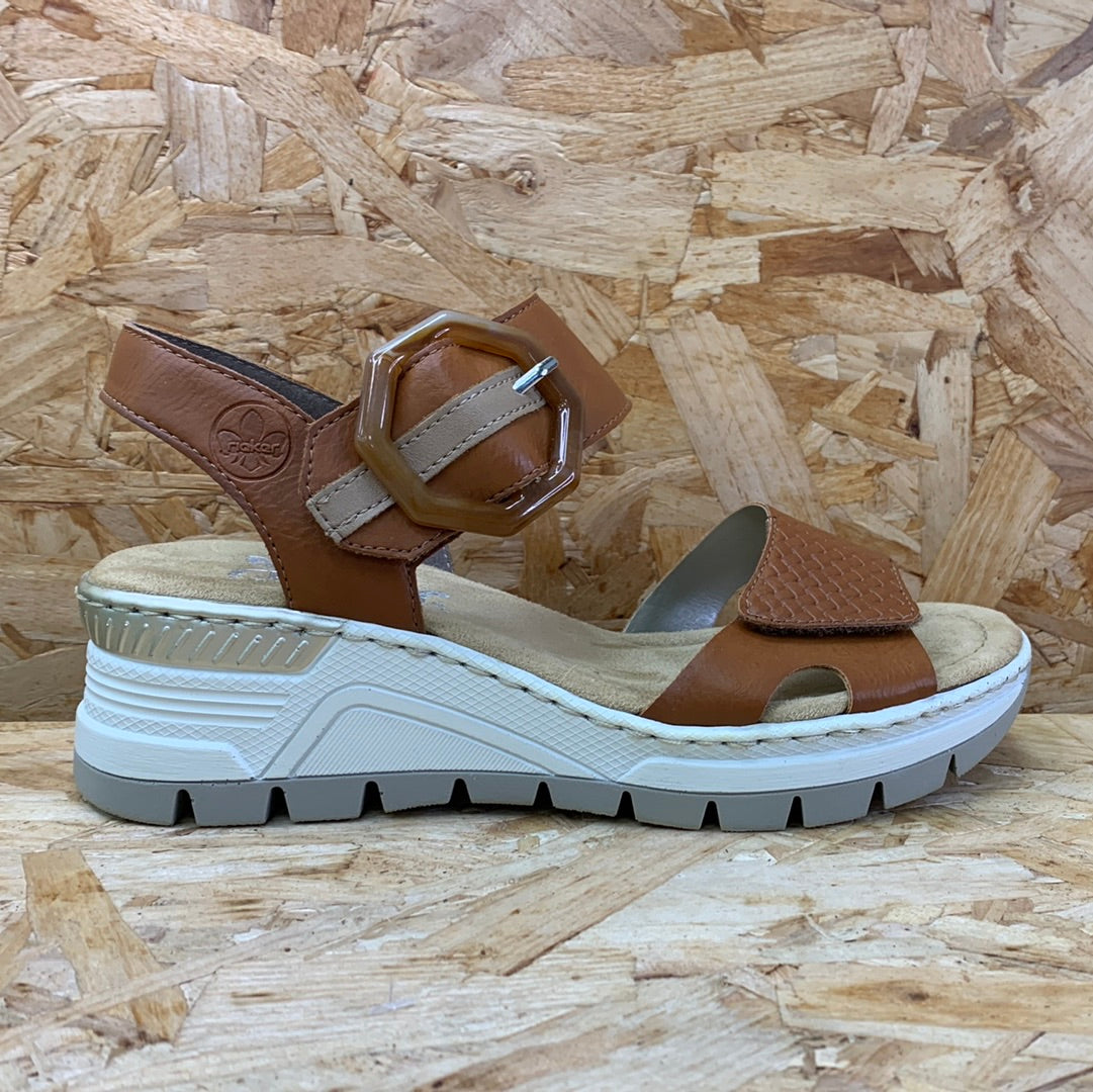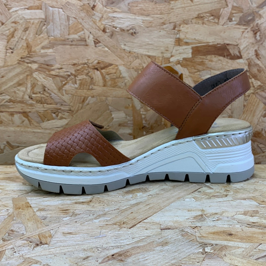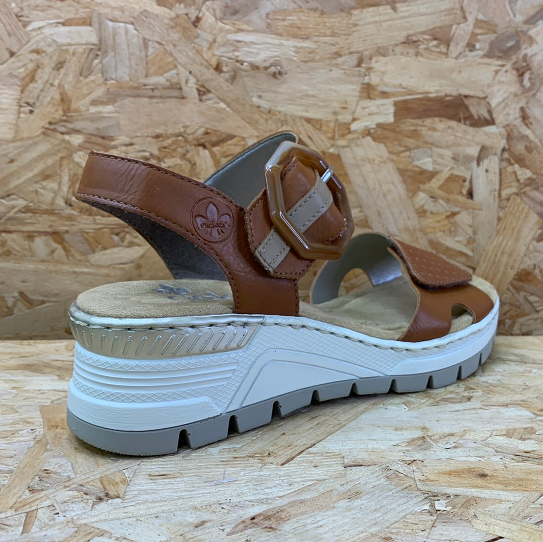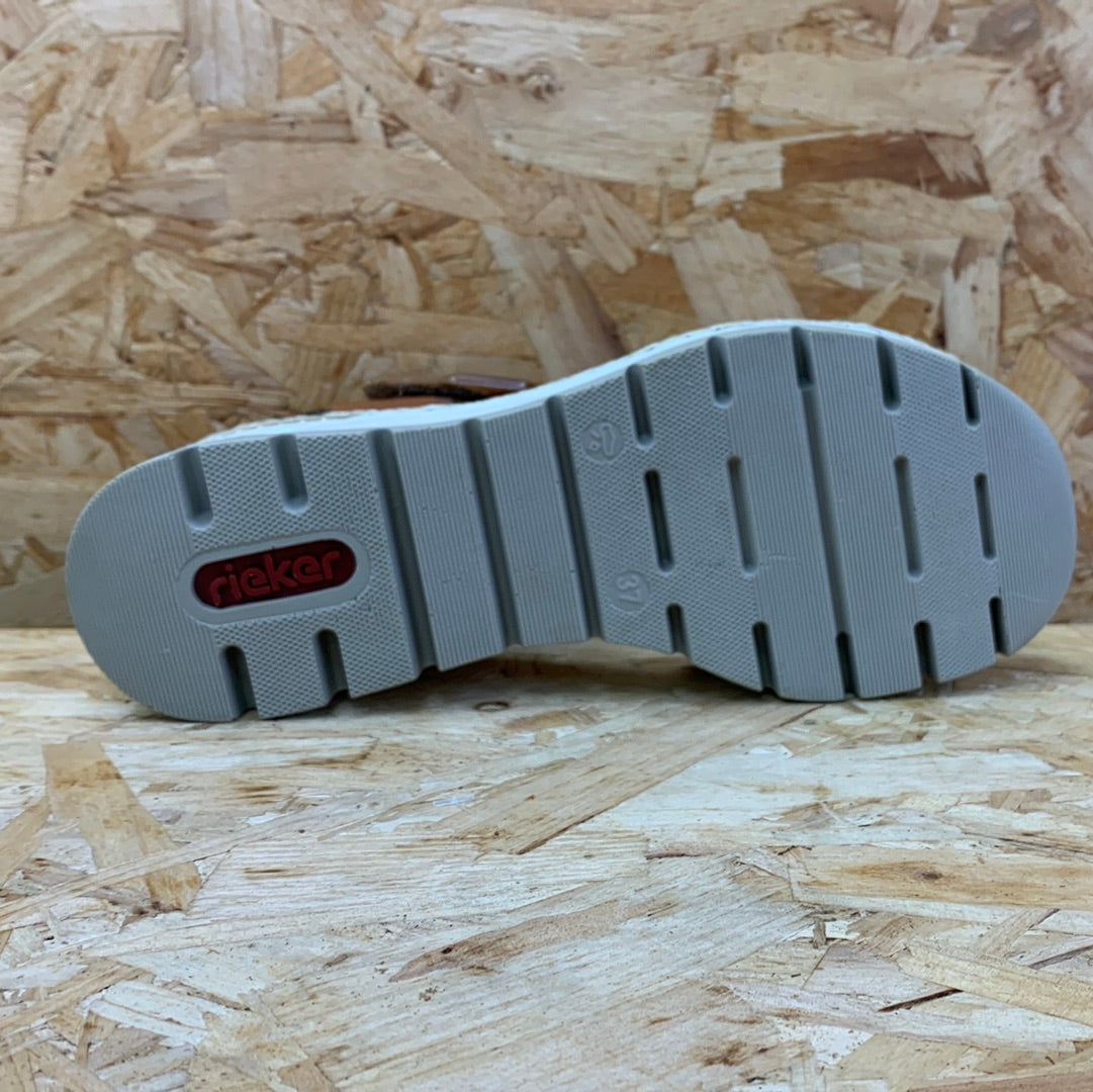 Rieker Womens Fashion Wedge Sandal in Brown. Faux buckle and fastened with hook and loop strap. Adjustable hook and loop strap across the front of foot with basket weave texturing . Chunky sports style sole. Lightweight.