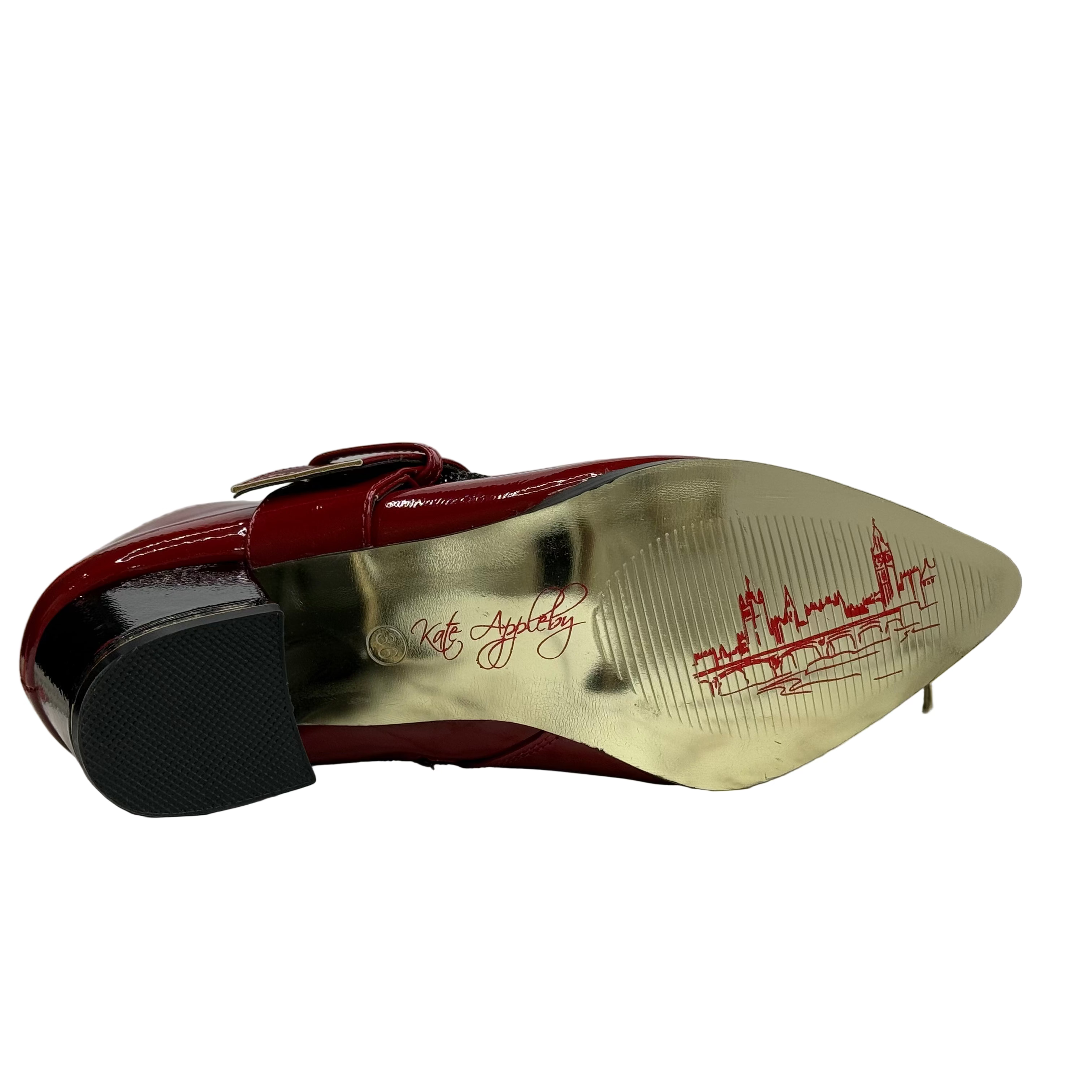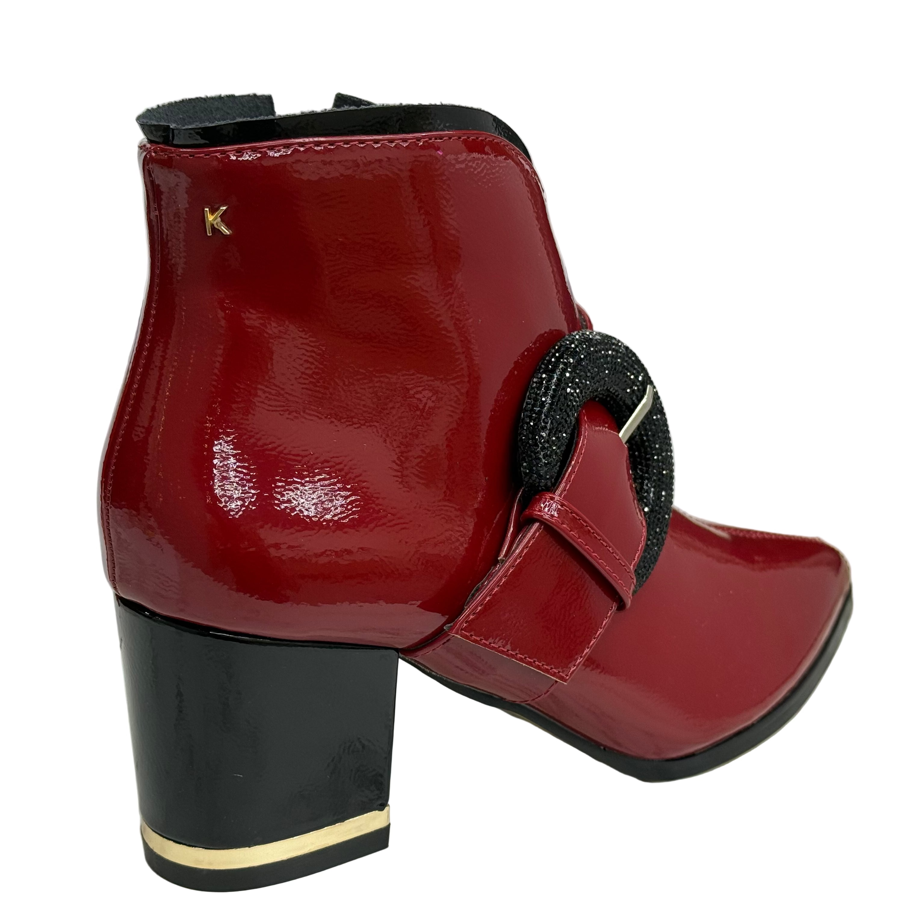 Step out in style with the Kate Appleby Womens Amlwch Ankle Boot in vibrant poppy red faux patent leather. Featuring a sturdy block heel, eye-catching large sparkly black buckle, and shiny gold Kate Appleby K logo. The convenient side zip makes slipping them on a breeze—ready to add a fun pop to your look!