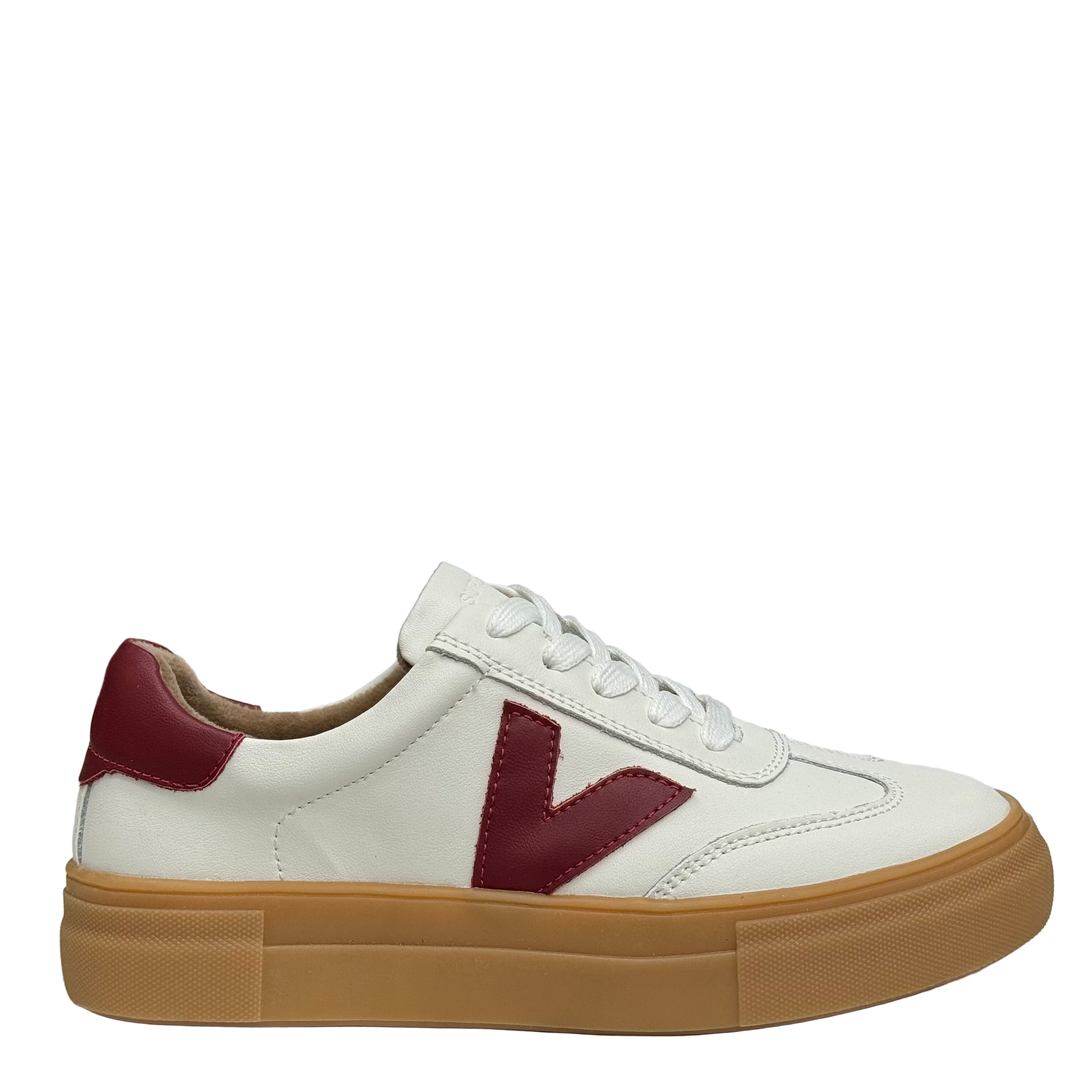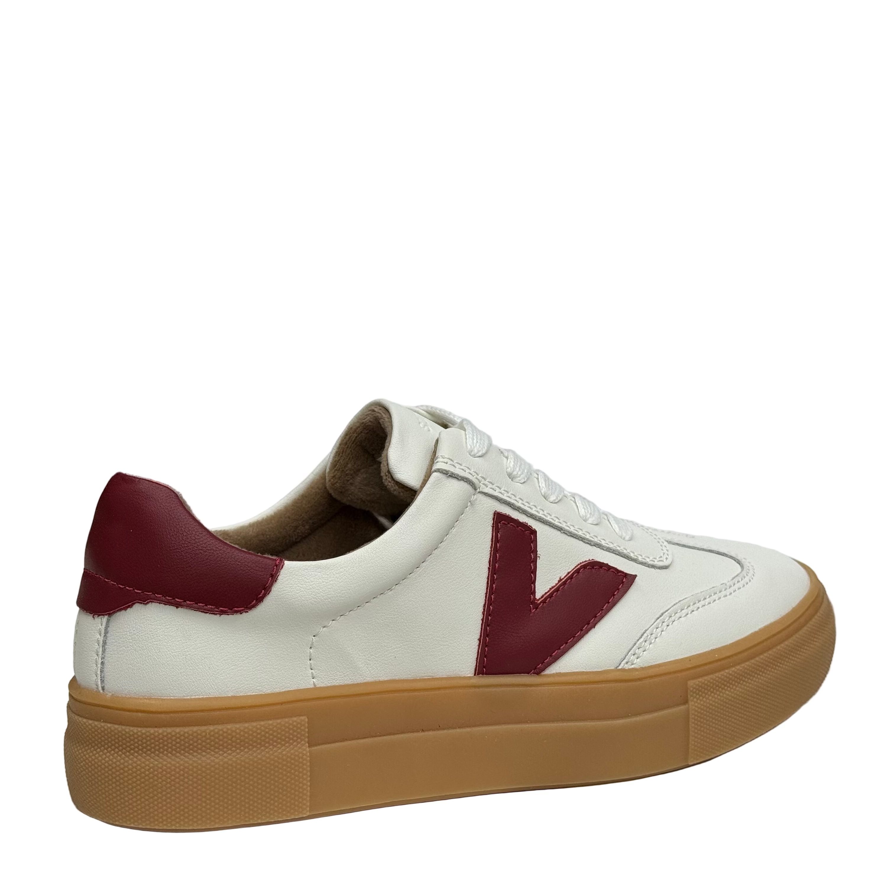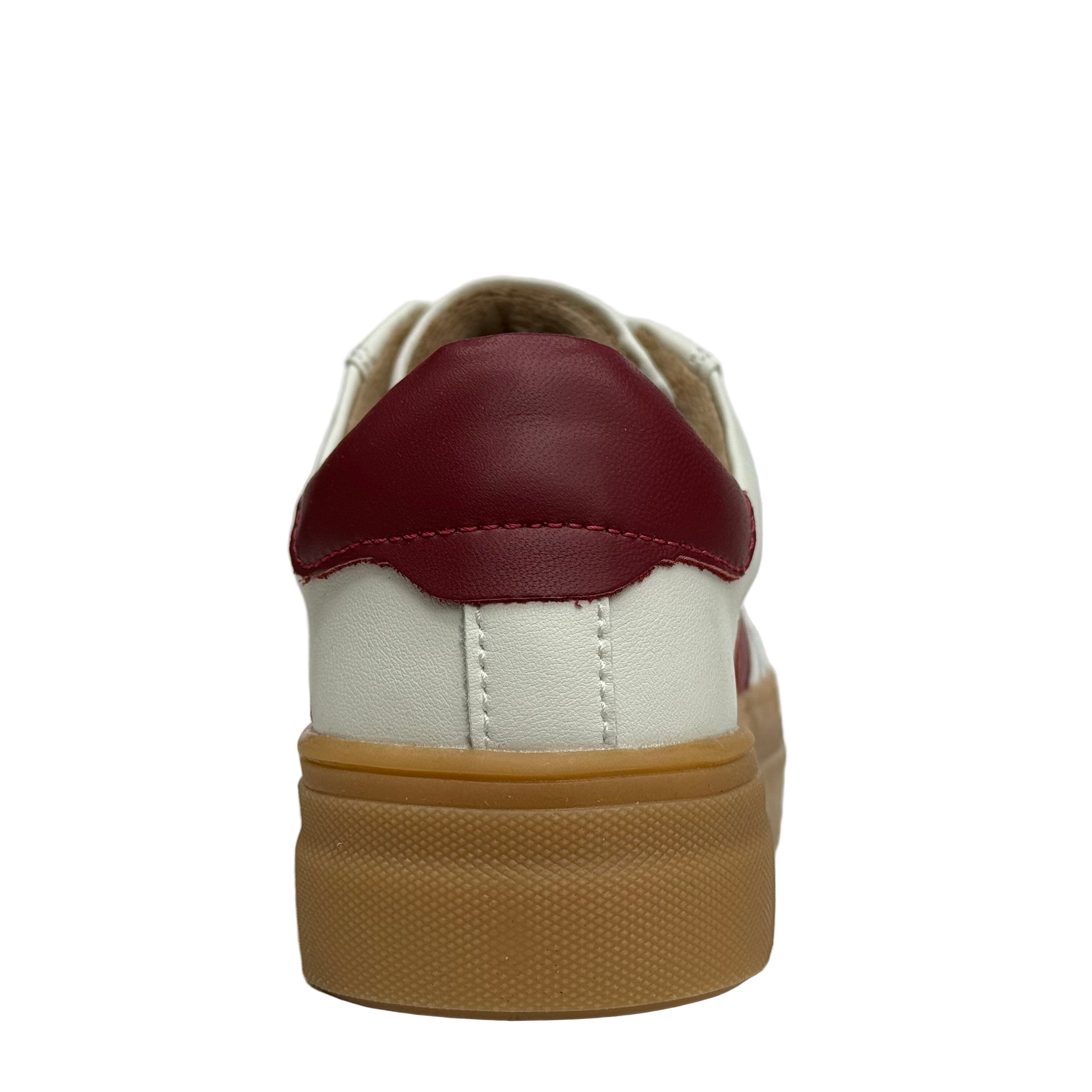 Drilleys Womens Ninety Trainers in Beige. Faux suede leather upper in beige with maroon accent detailing. Gum sole.