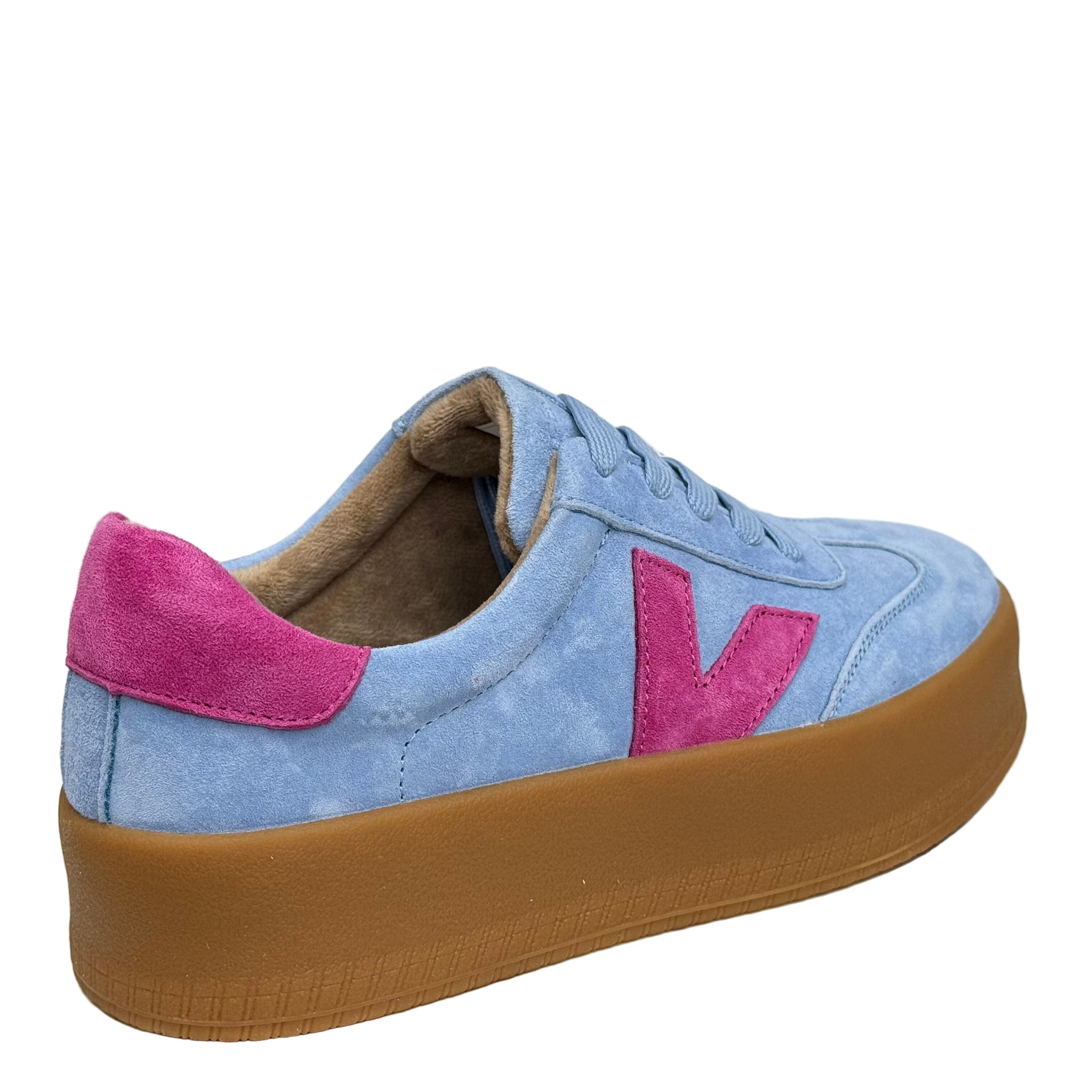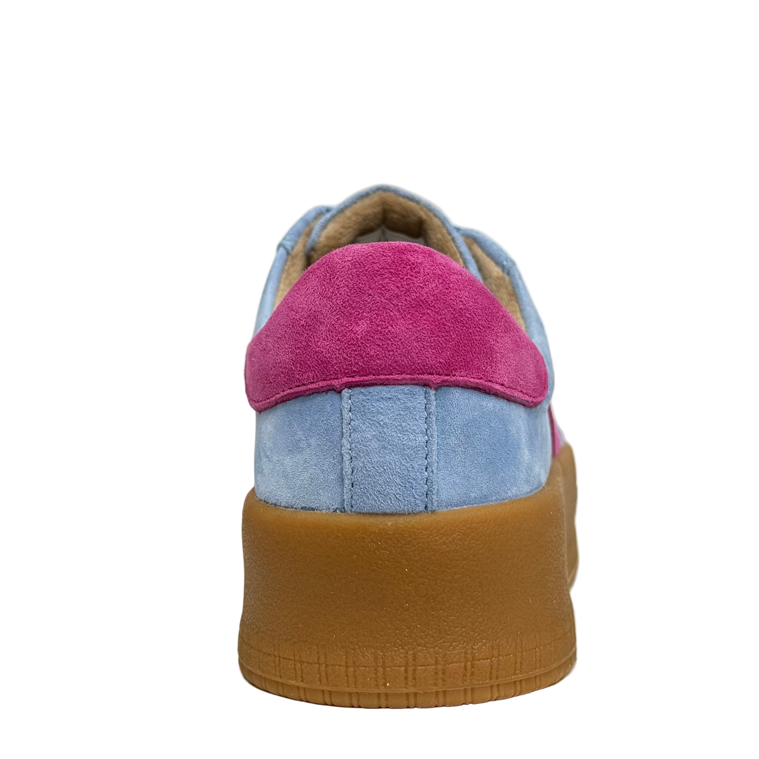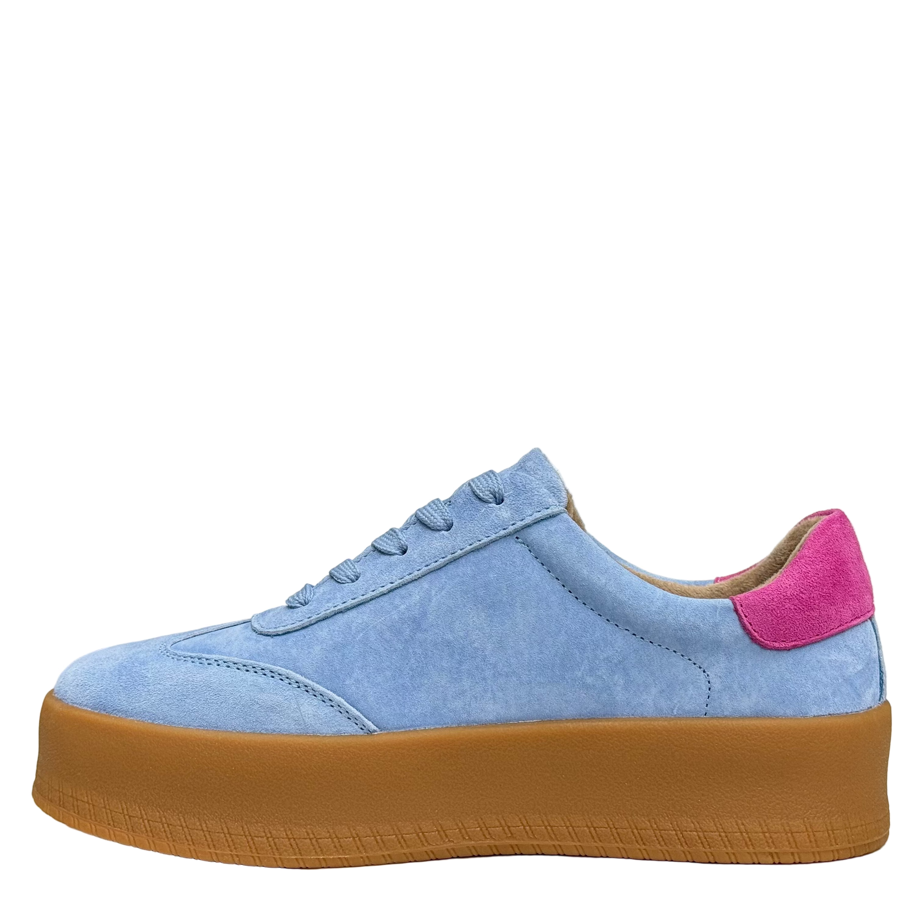 Drilleys Womens Eighty Four Trainers in Blue Bell. Faux suede leather upper in vibrant blue with deep pink detailing. Platform gum sole.