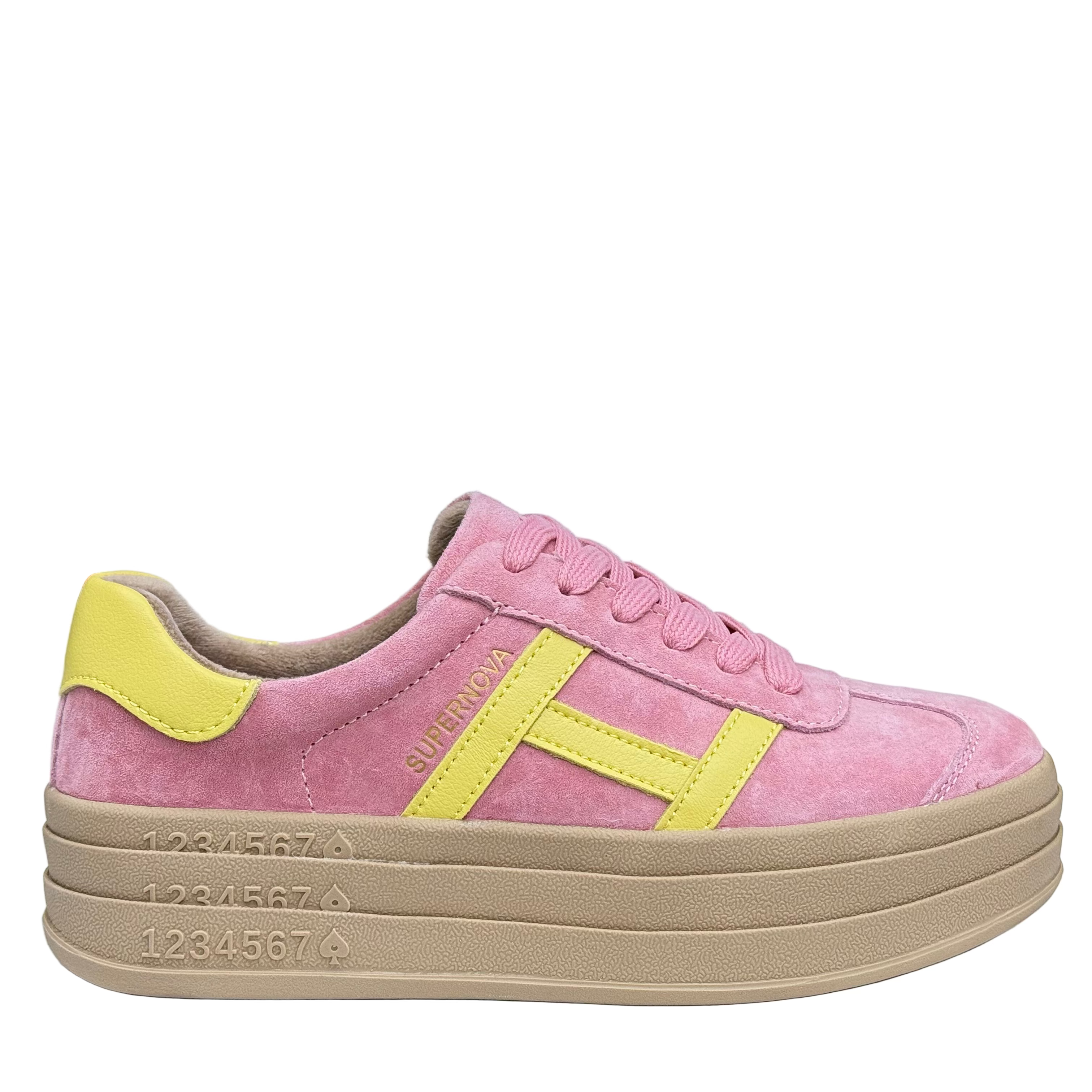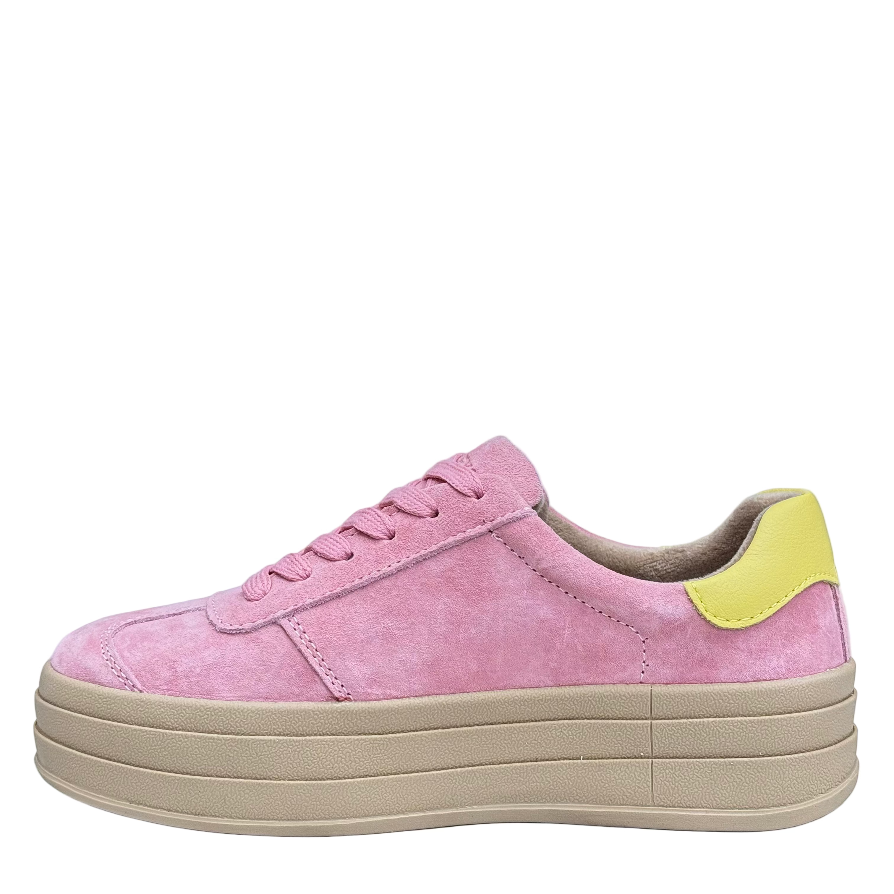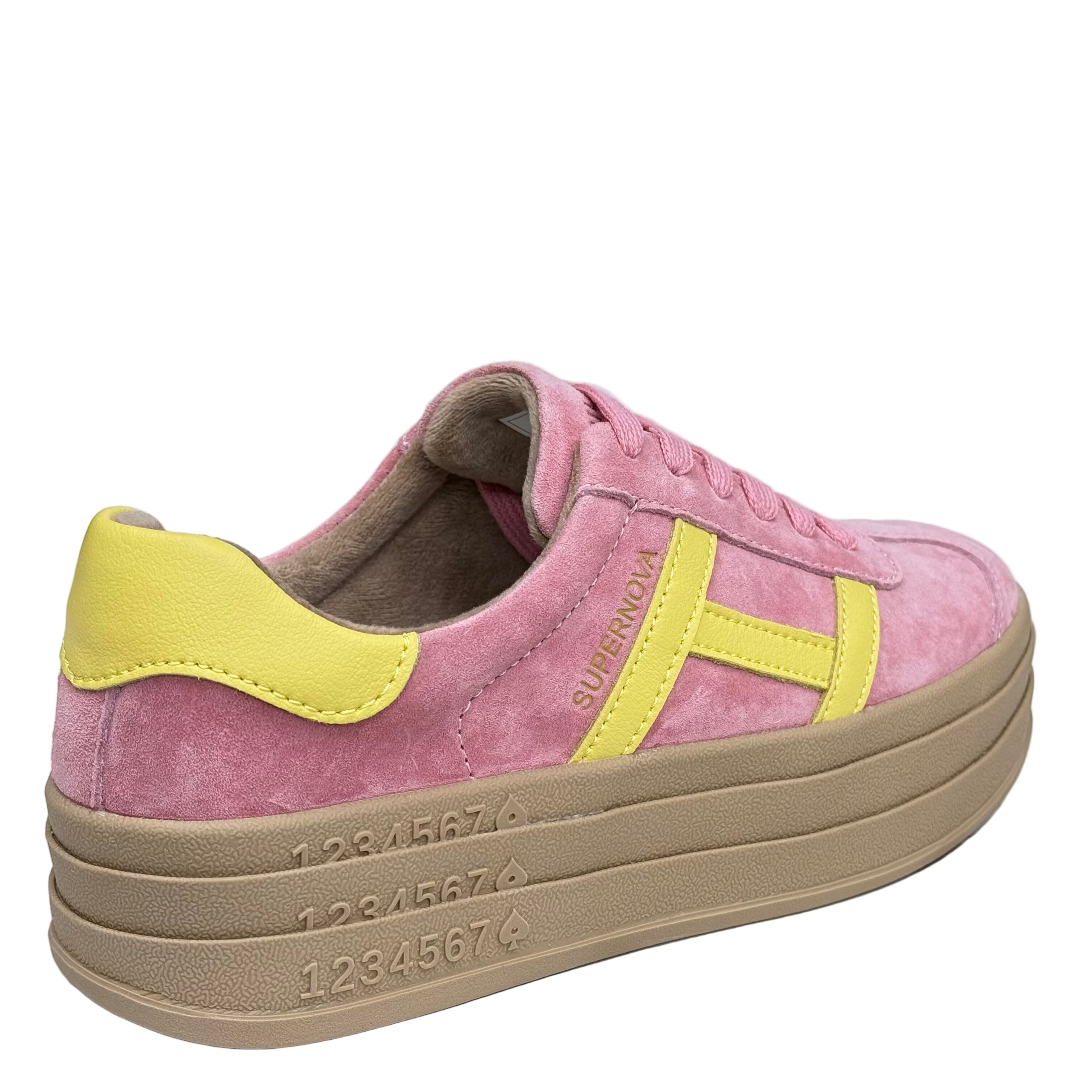 Drilleys Womens Sixty Eight Trainers in Candy Cane Pink. Faux suede leather upper in baby pink with yellow detailing. Layered gum sole.
