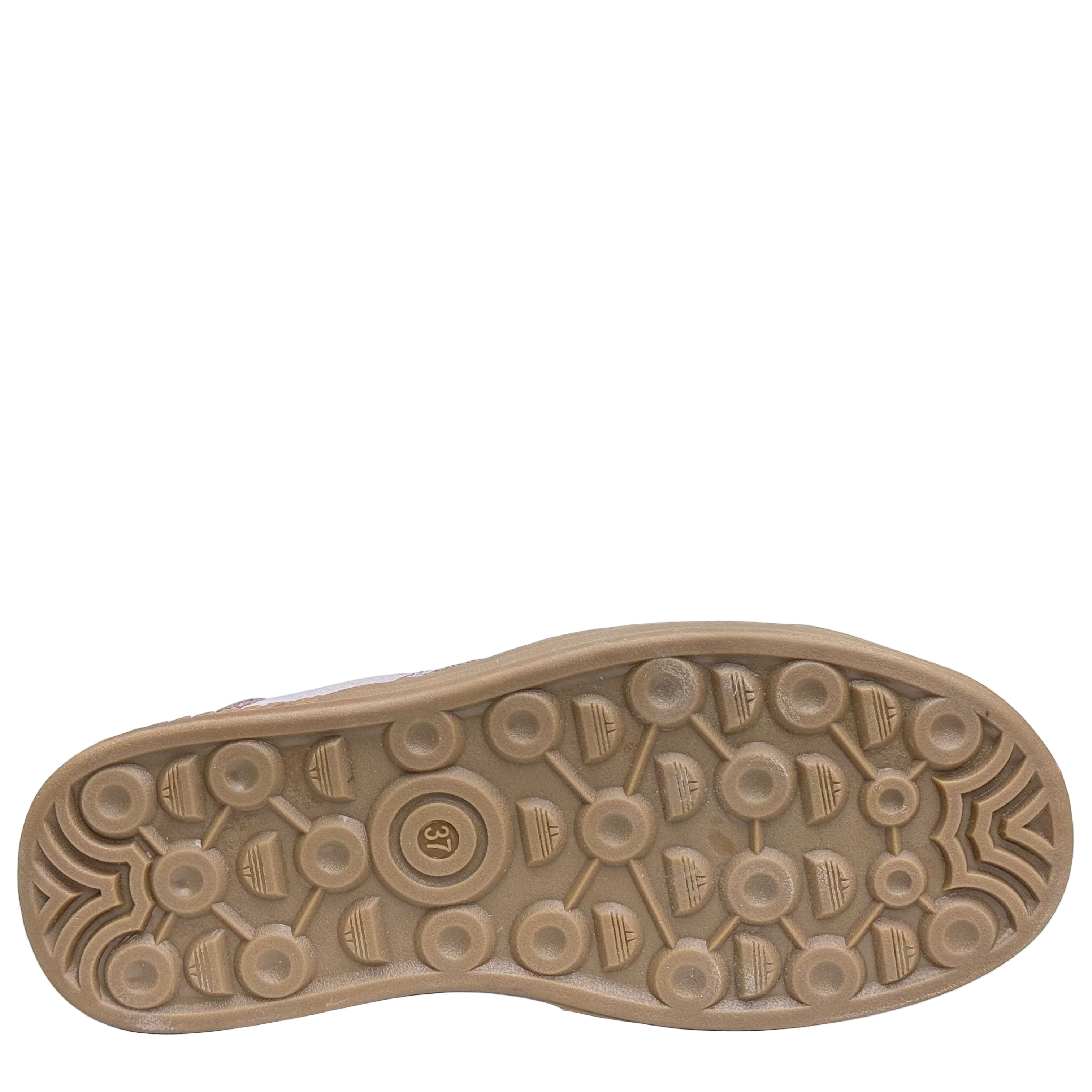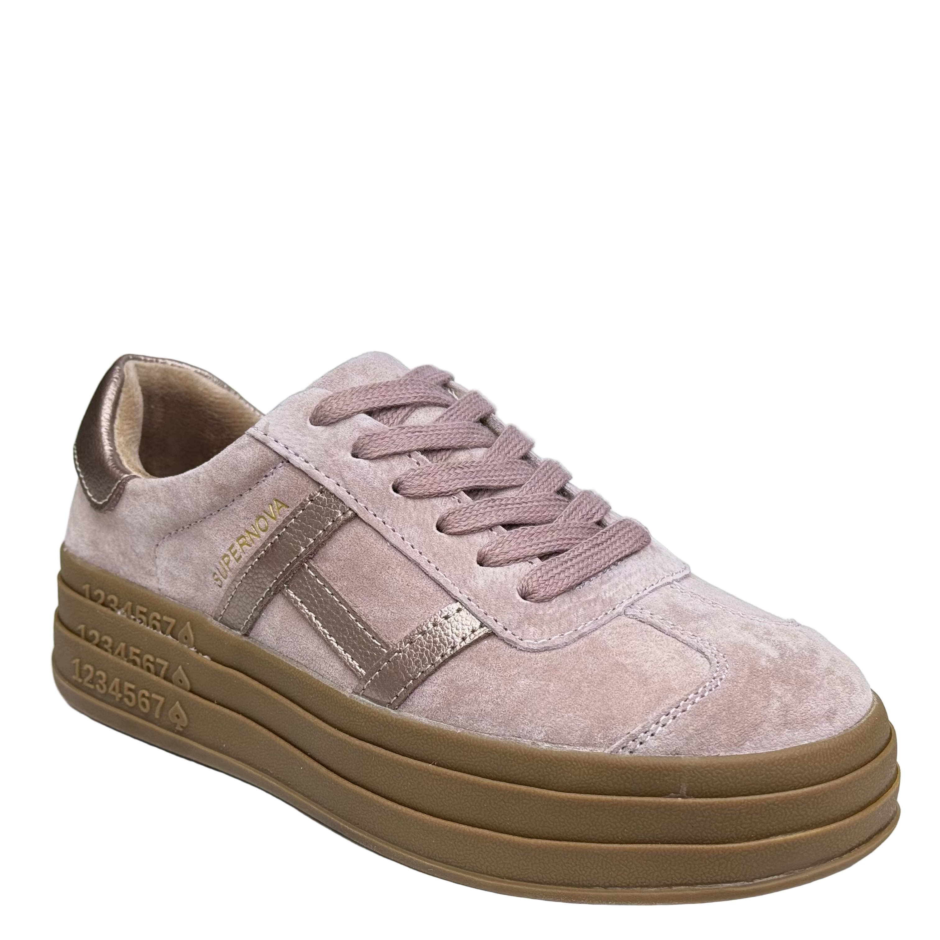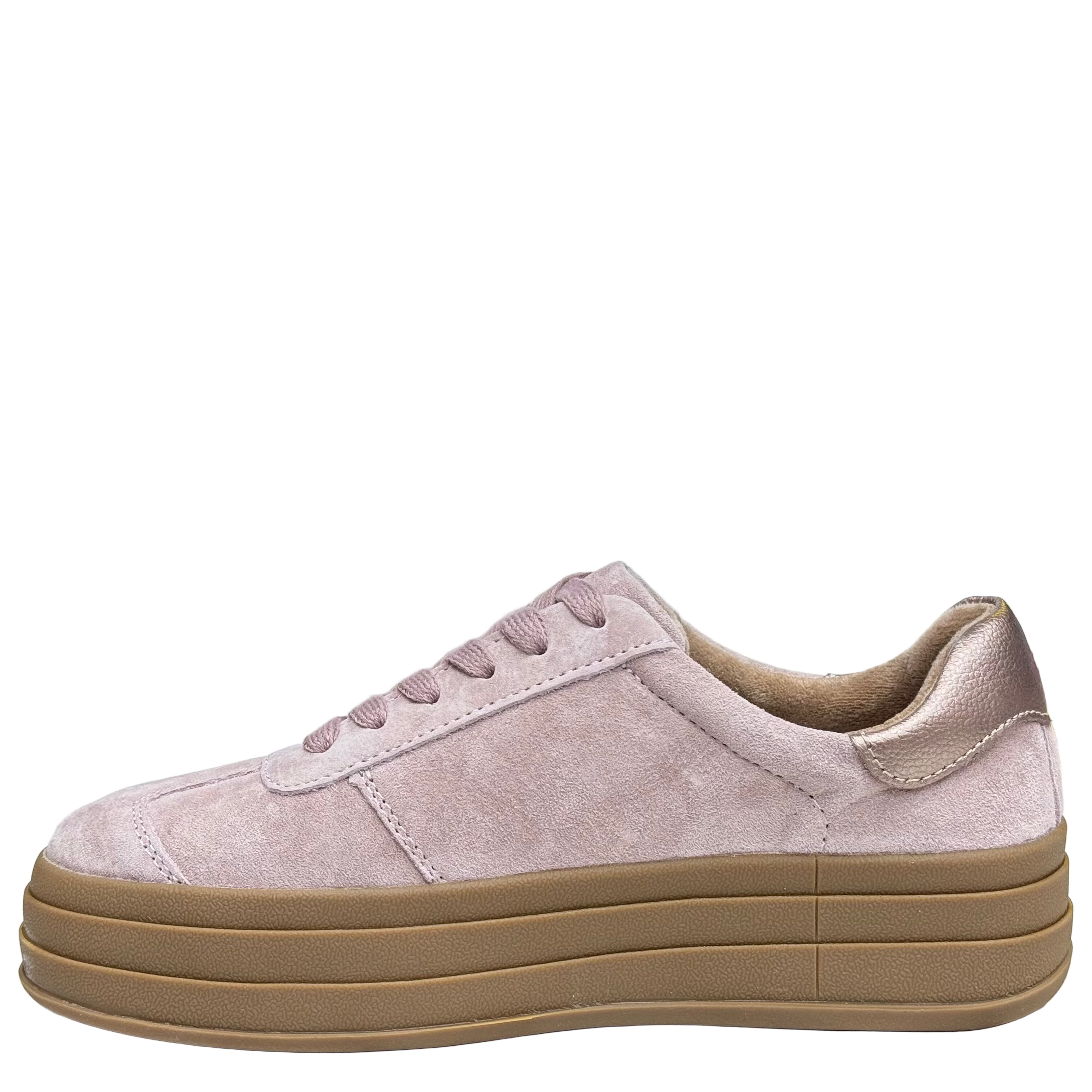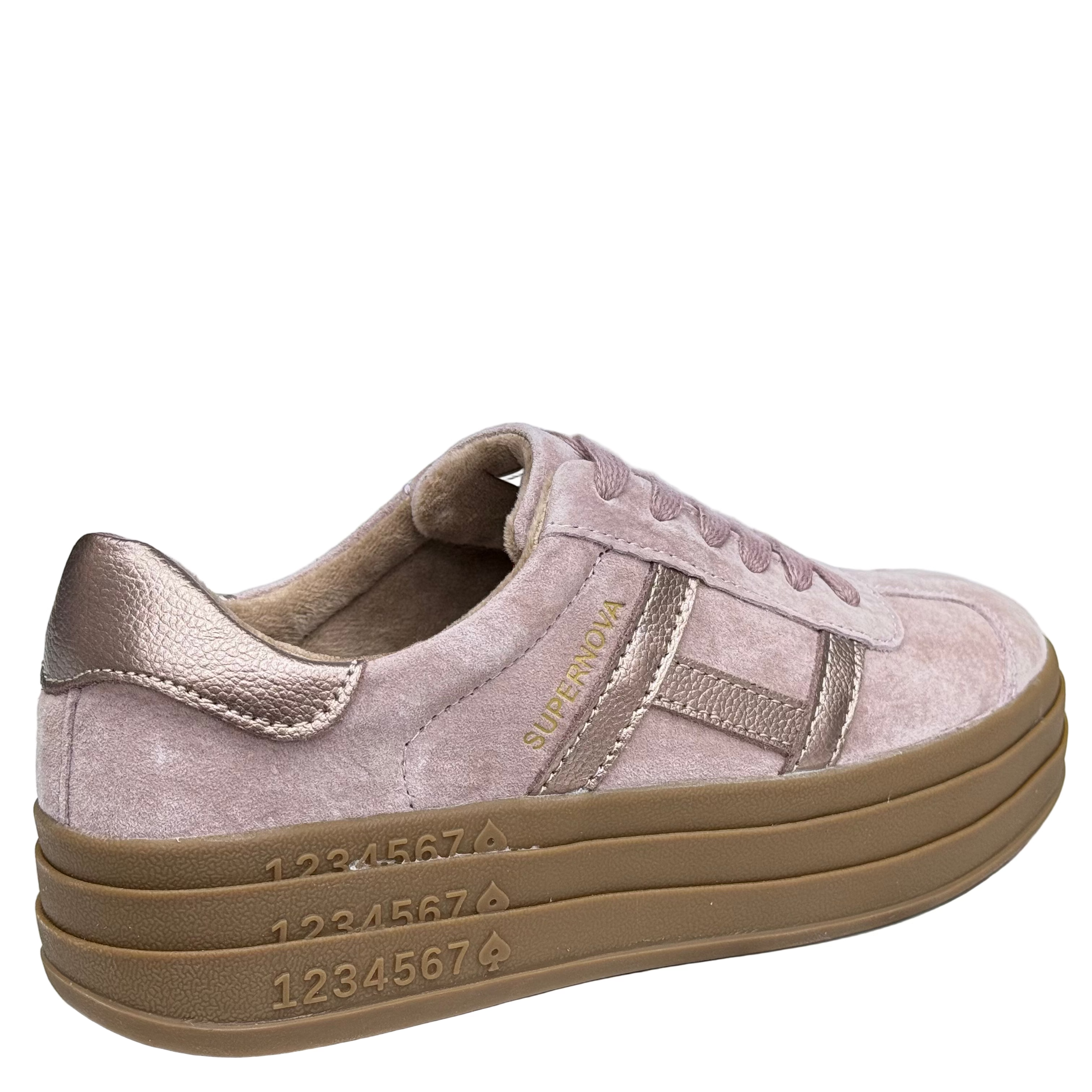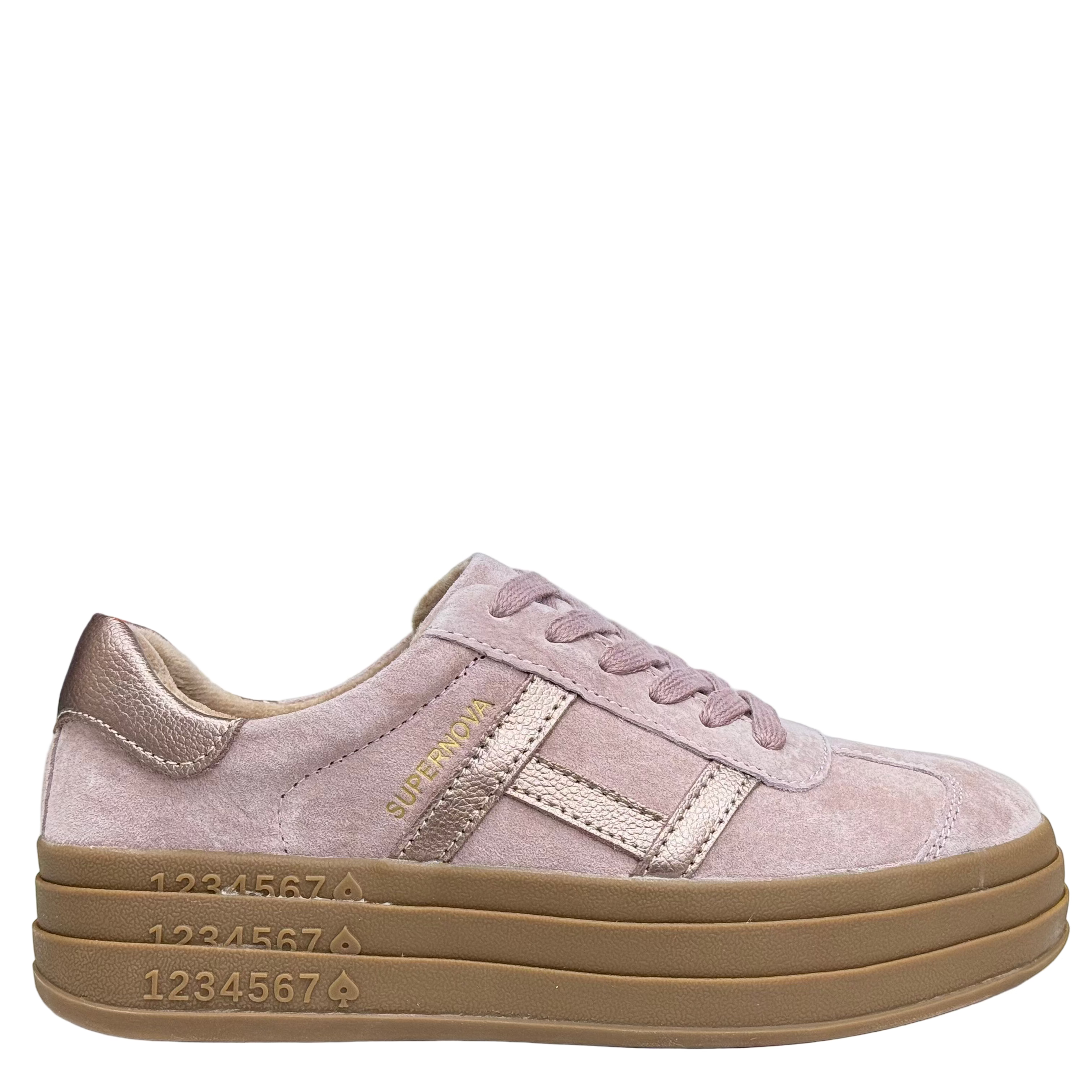 Drilleys Womens Sixty Eight Trainers in Pink Daisy. Faux suede leather upper in dusky pink with rose gold detailing. Layered gum sole.