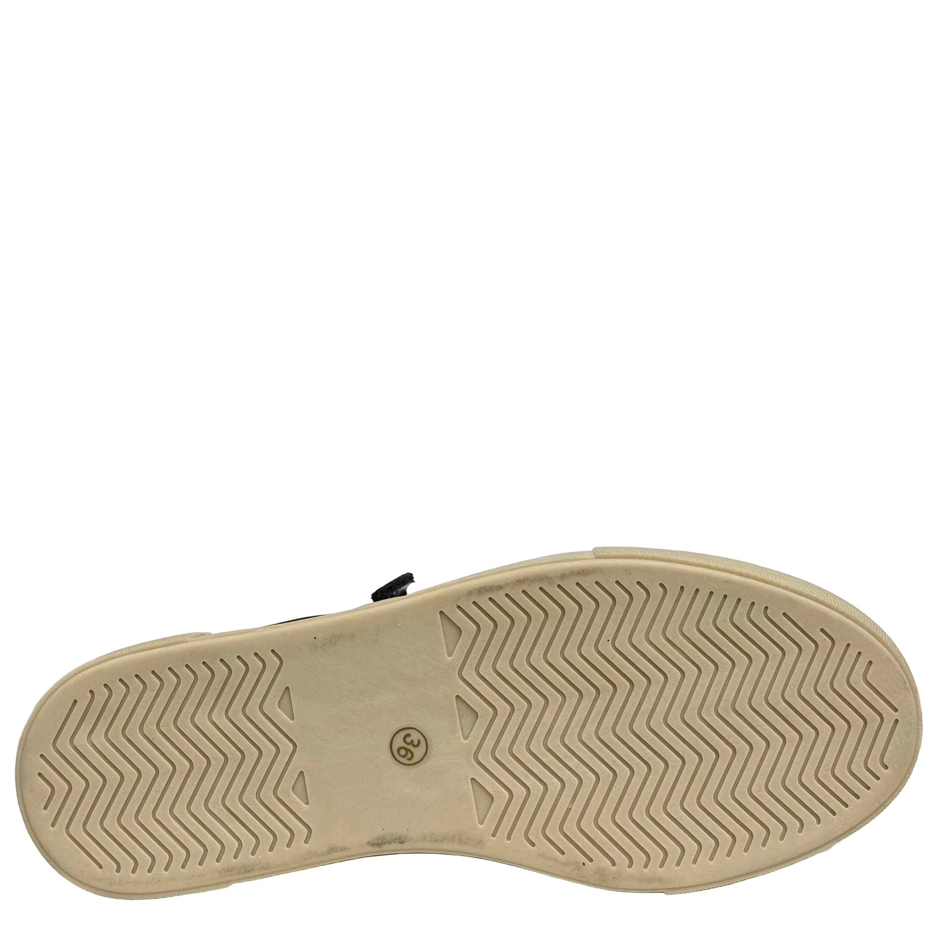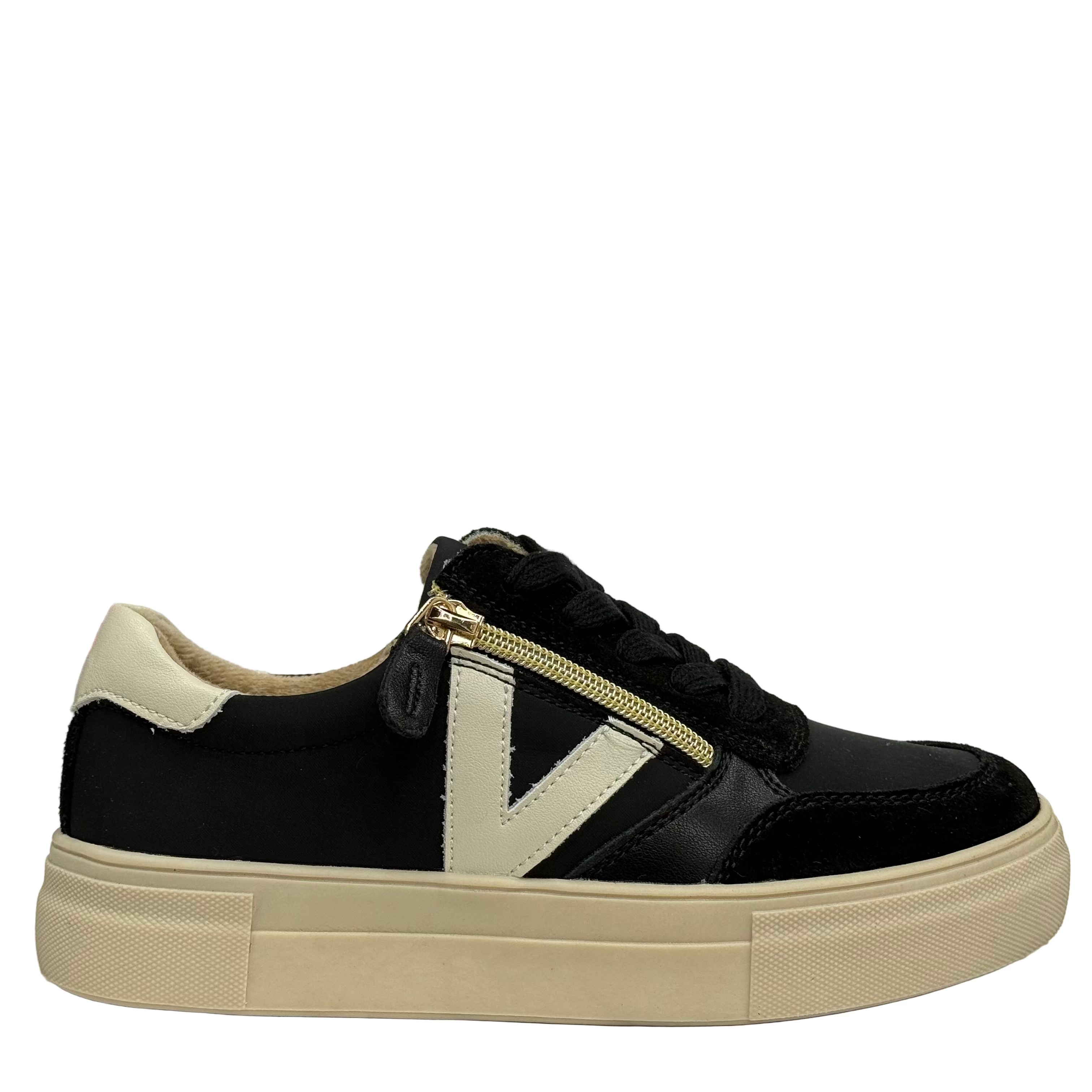 Drilleys Womens Eighty One Trainers in Whipped Ink. Faux suede leather upper in Black with Beige detailing. Side zip for ease of foot entry. Beige sole.