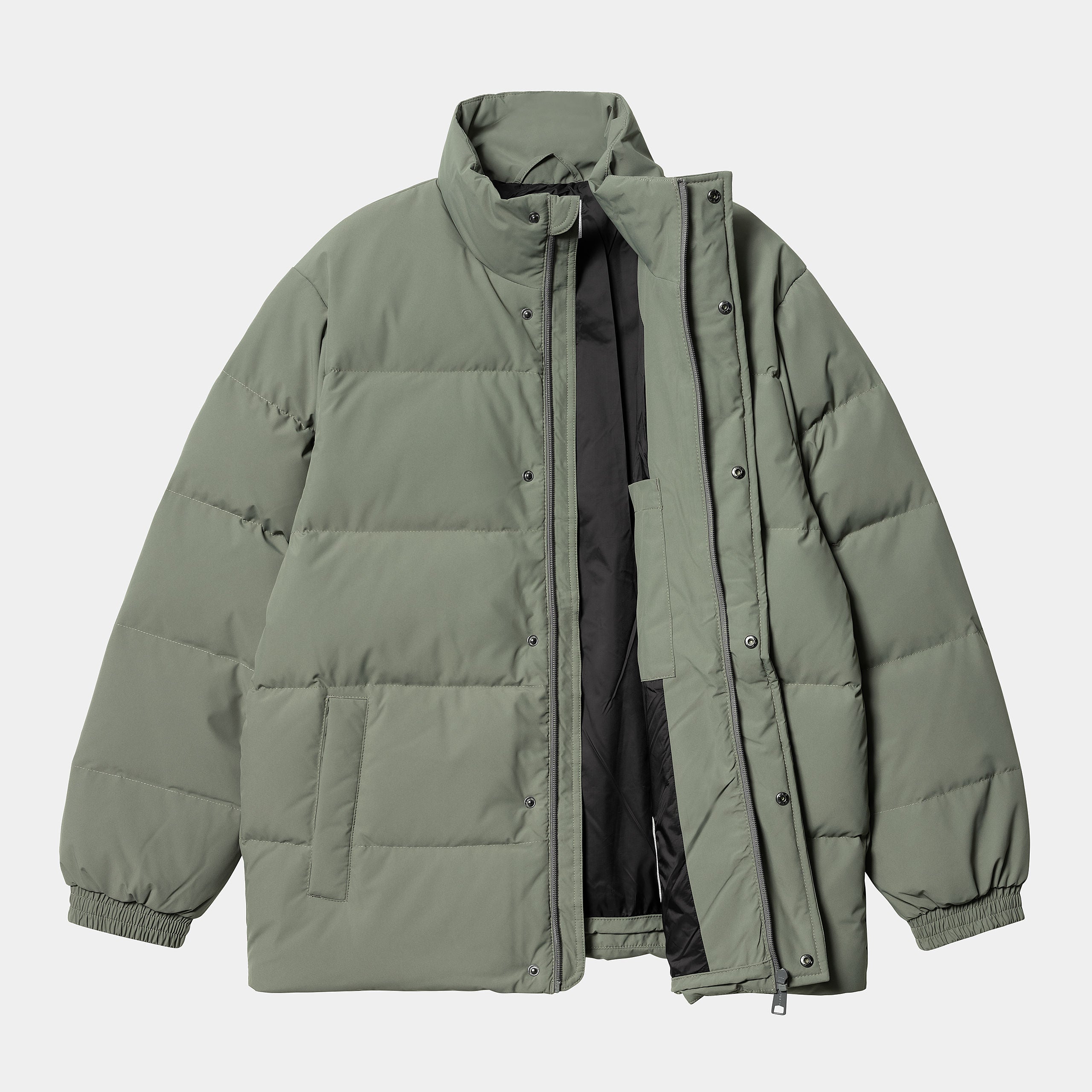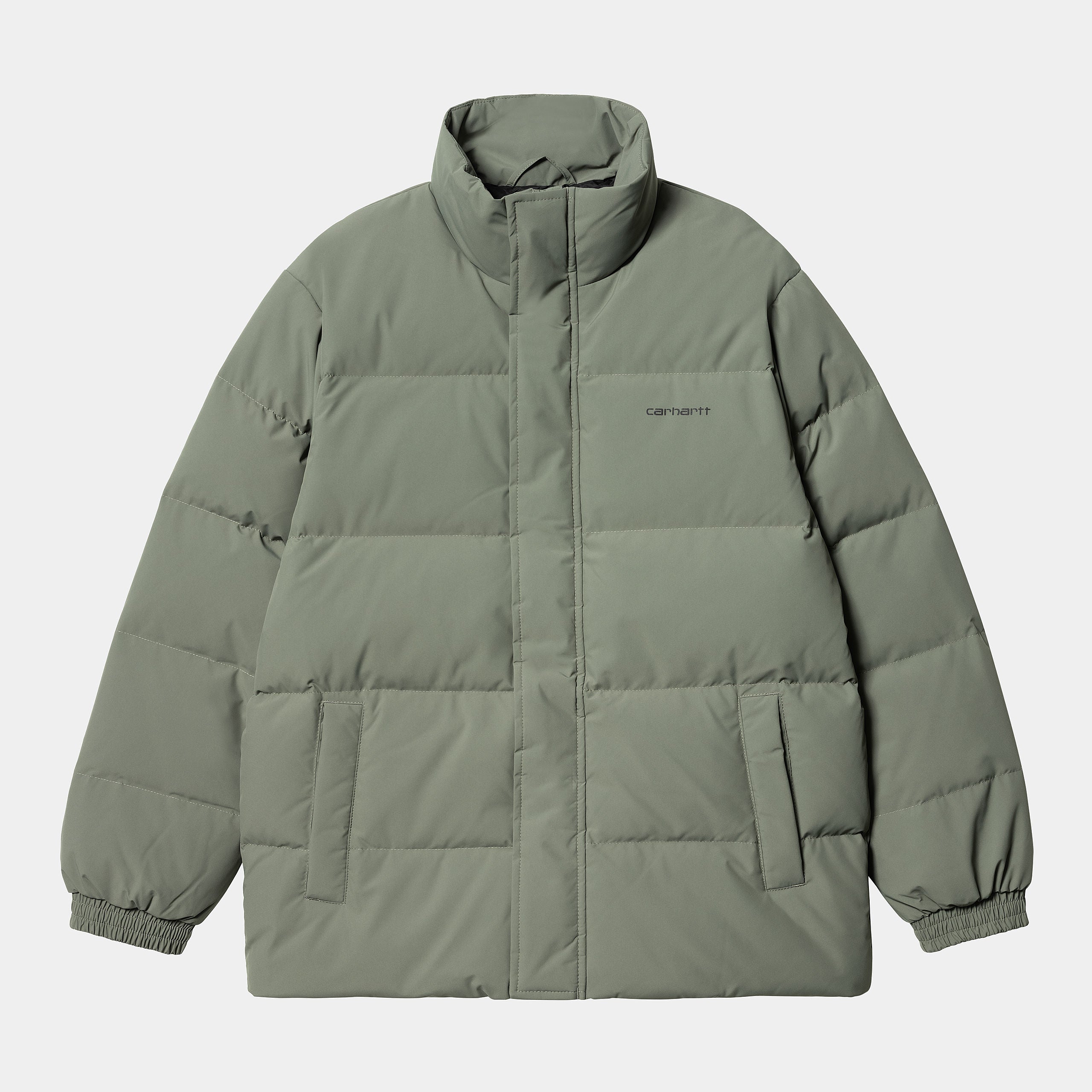 Constructed from water-repellent polyester taffeta, the Carhartt Danville jacket is filled with feather-down for warmth and lined with nylon taffeta. Additional insulation comes by way of an adjustable hem, elasticated cuffs, and a high collar. Two side pockets and a Carhartt WIP Script Logo on the chest complete the design.