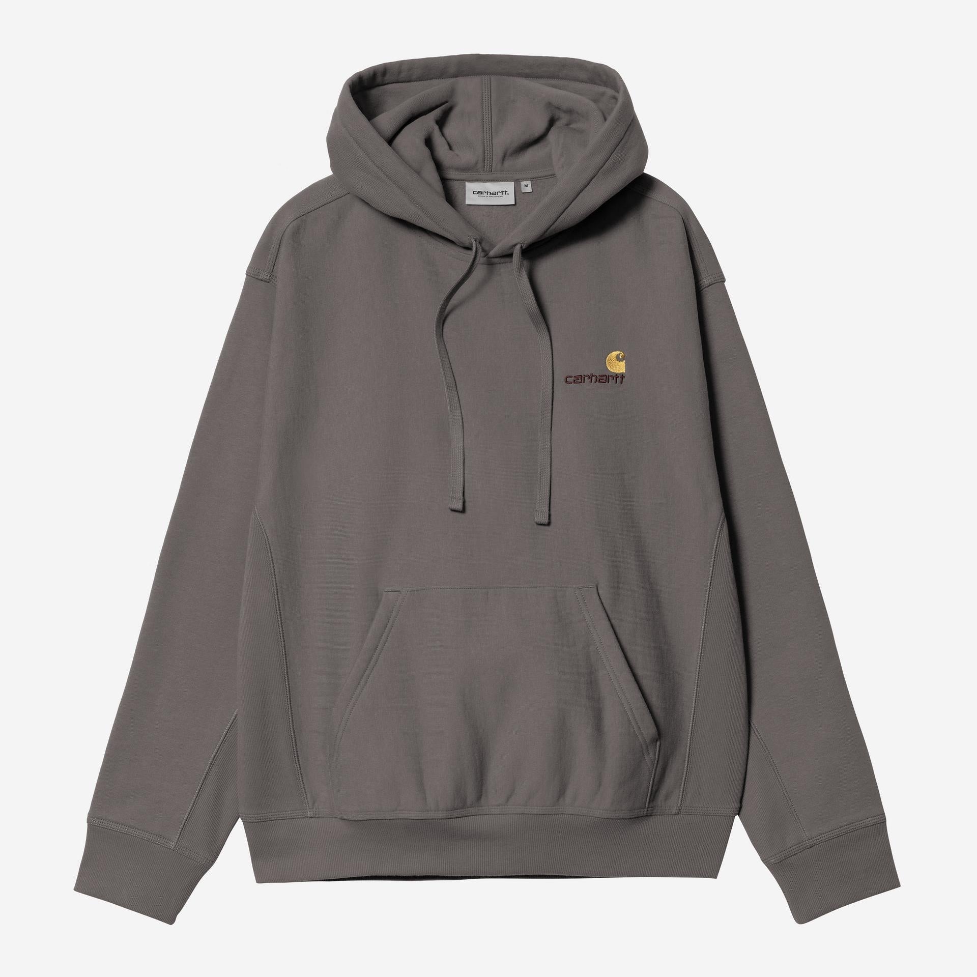 The Carhartt WIP Hooded American Script Sweatshirt is constructed from a cotton-polyester blend and brushed for extra softness and warmth without losing breathability. Features a kangaroo pocket. This garment has a loose, boxy silhouette.