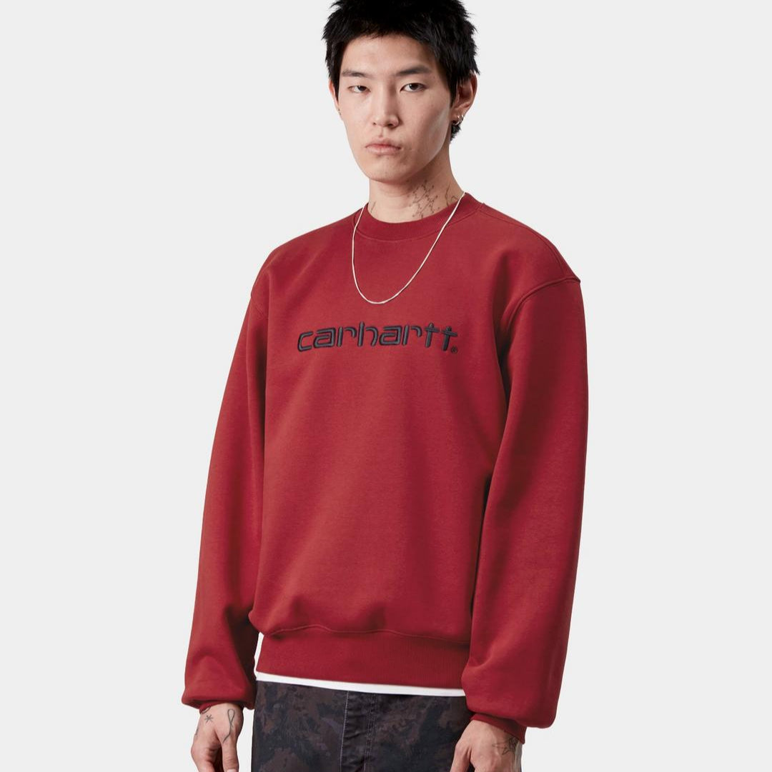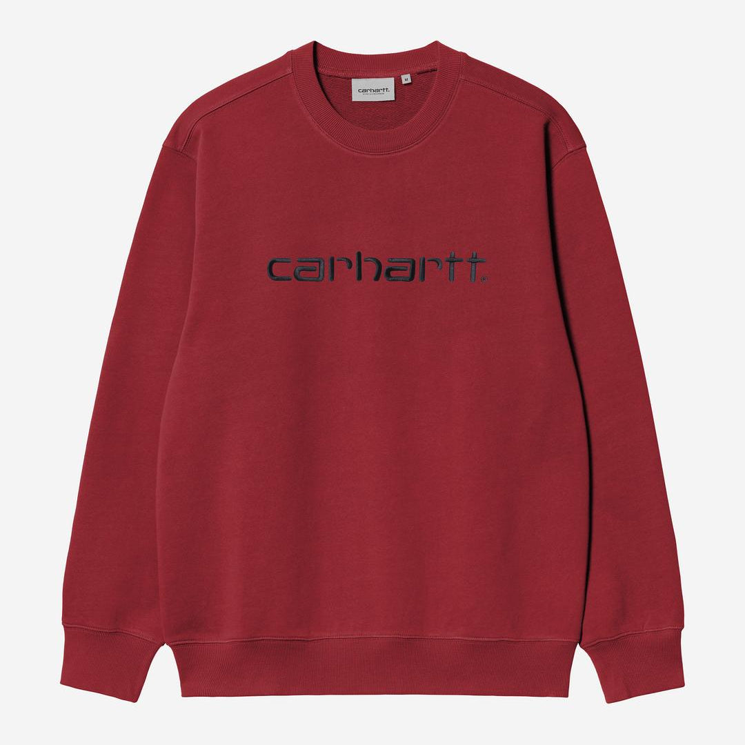 The Carhartt Sweatshirt is made in a loose fit from heavyweight cotton-poly jersey fabric, which has been brushed for a fleece-like backing. It also features a ribbed collar, hem and cuffs. An embroidered Script Logo appears across the chest.