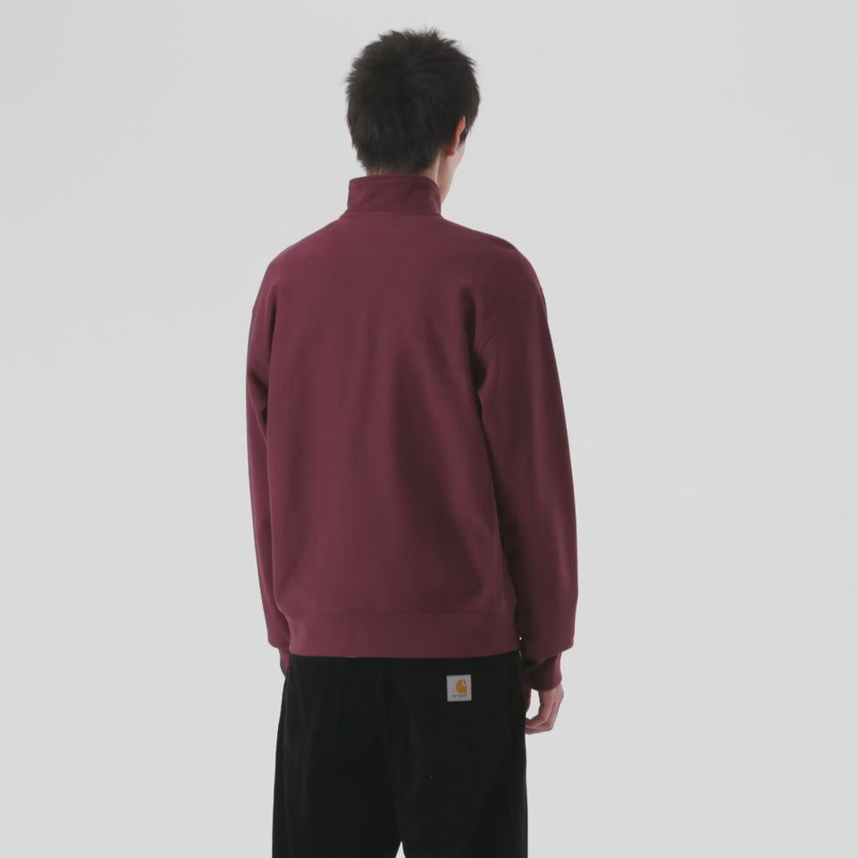 The Carhartt WIP Half Zip American Script Sweatshirt is constructed from a 12.3 oz cotton-polyester blend and brushed for extra softness and warmth, without losing breathability. The garment features a highneck with a zipper and a small logo. Appears in a loose, boxy silhouette.