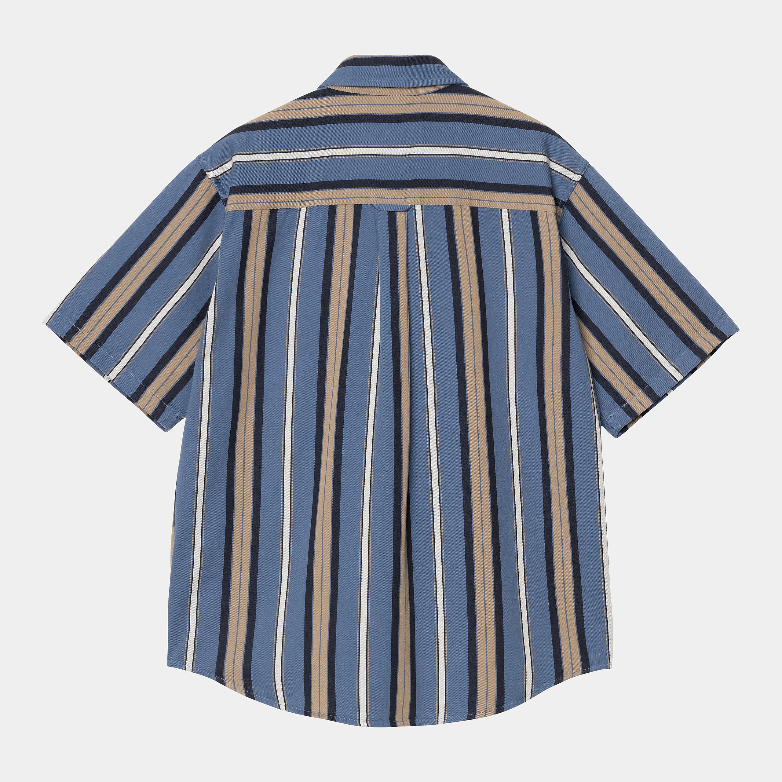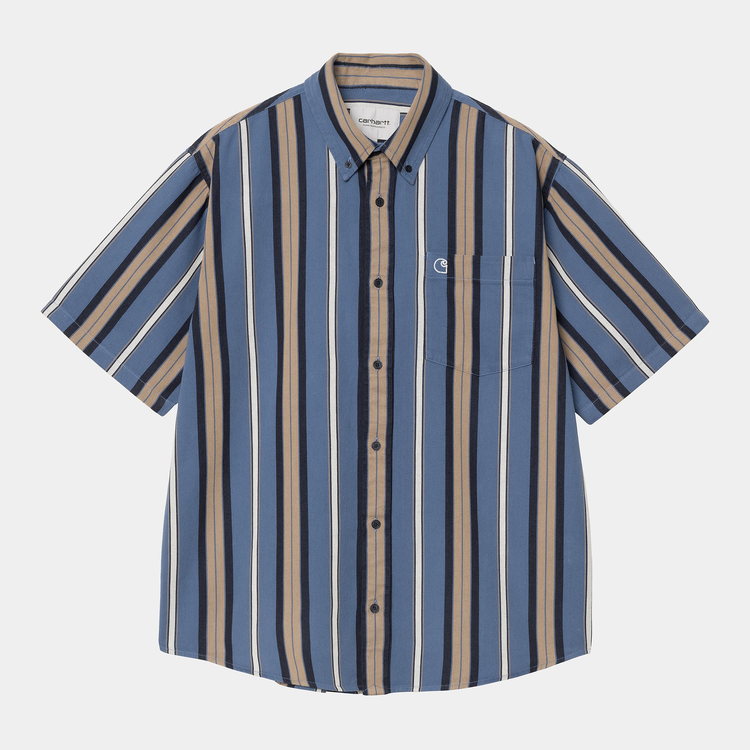 The Carhartt WIP Short Sleeve Jarrell Shirt is a loose fit style made from cotton twill, featuring allover vertical stripes. The item also has a buttoned front and collar. An embroidered 'C' Logo appears on the chest pocket.