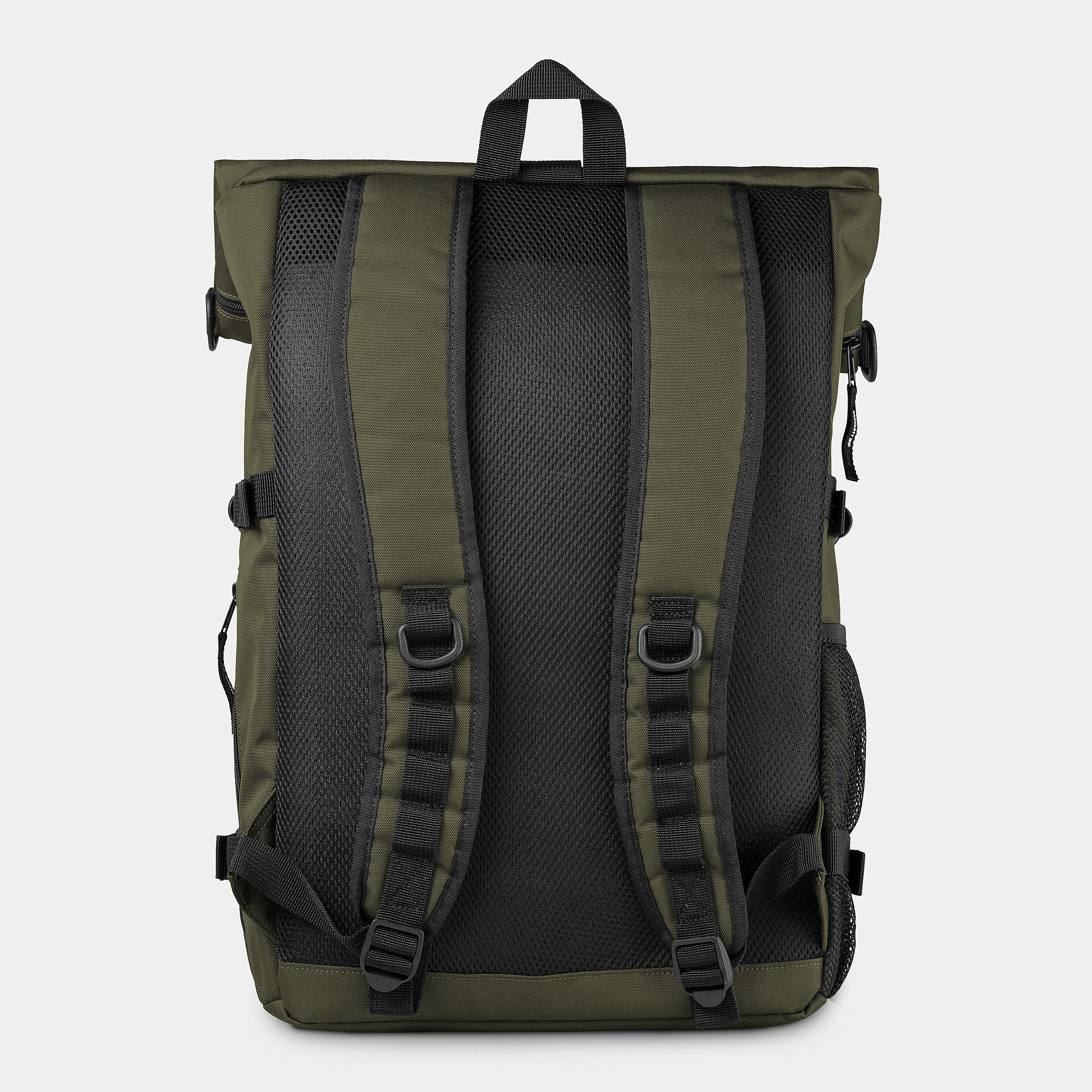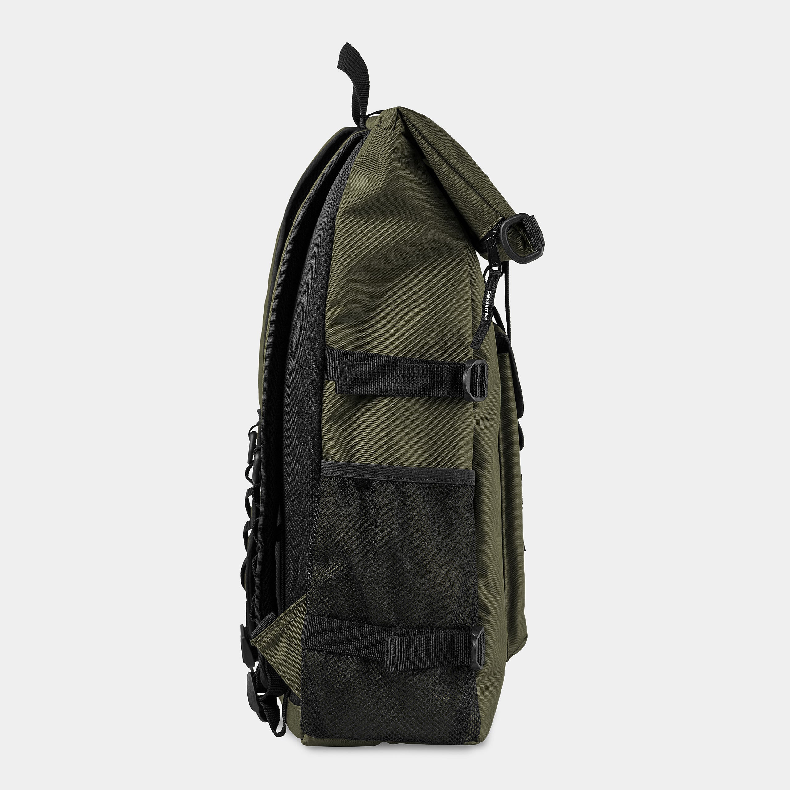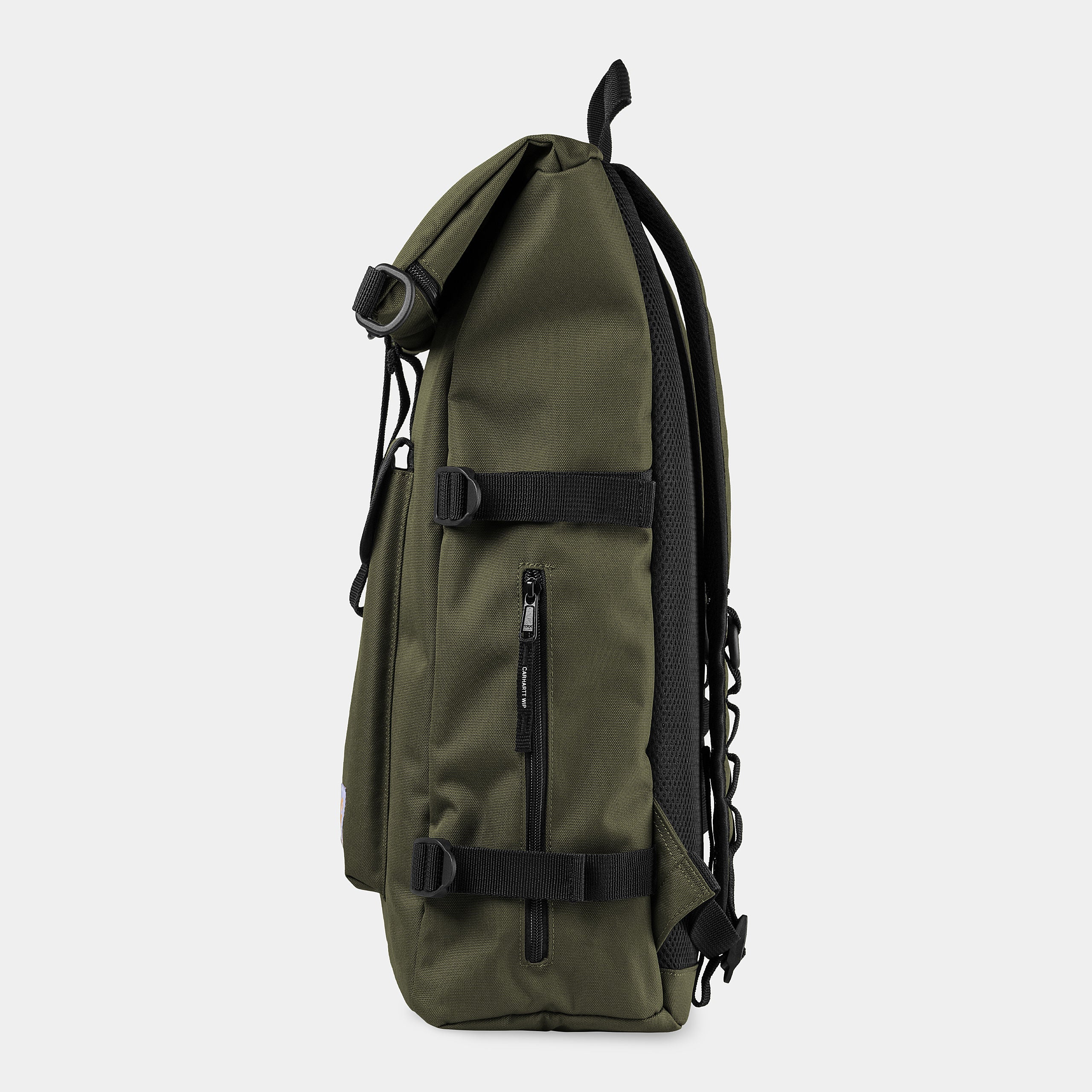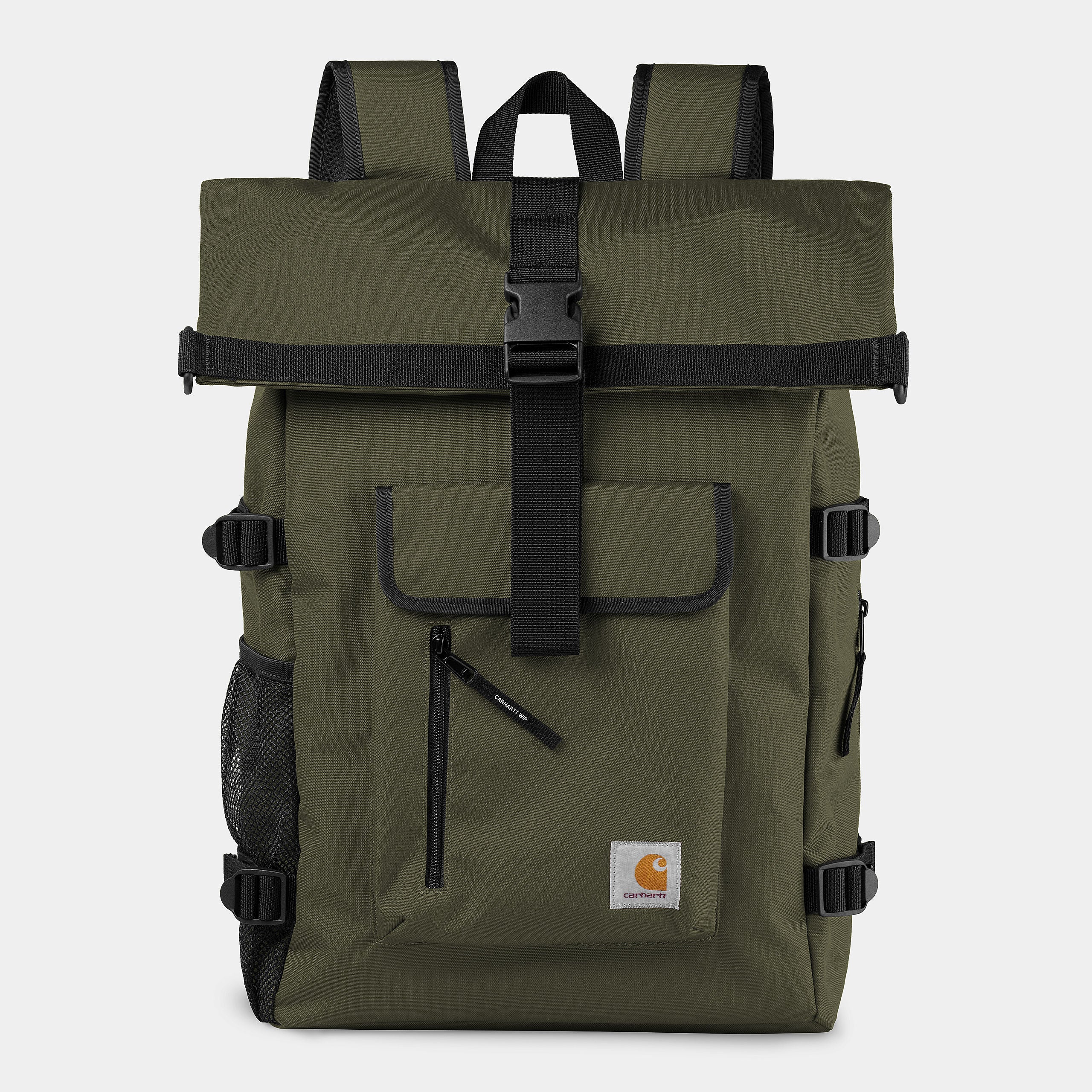 The Philis Backpack is an expandable style constructed from water-repellent, recycled polyester canvas. It features an unlined main compartment with a zip and flap closure, a padded inside pocket, and adjustable shoulder straps.