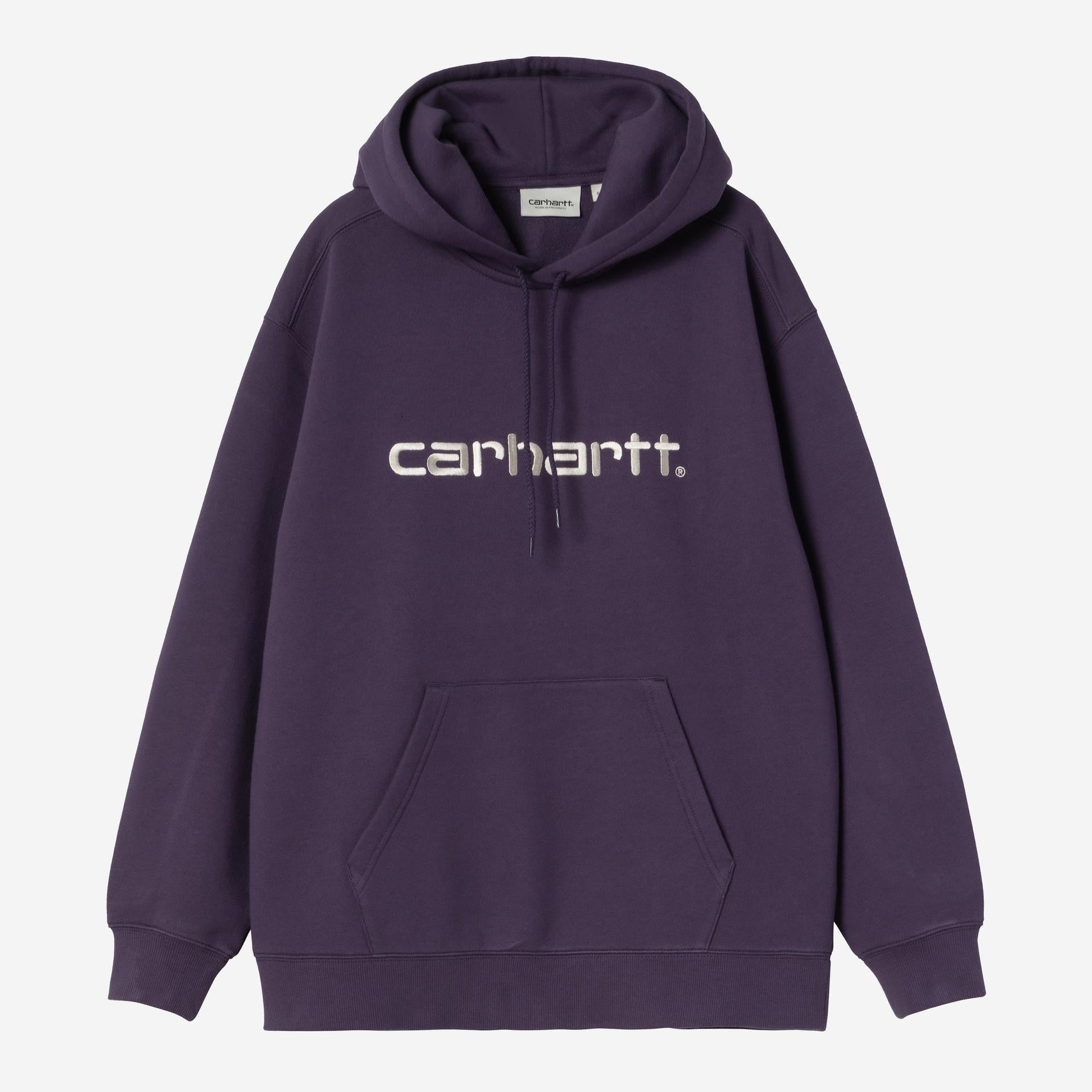 The Carhartt WIP Women's Hooded Carhartt Sweatshirt is made from heavyweight polycotton jersey with a brushed, fleece-like backing. It also has a regular fit. An embroidered Script Logo appears across the chest.