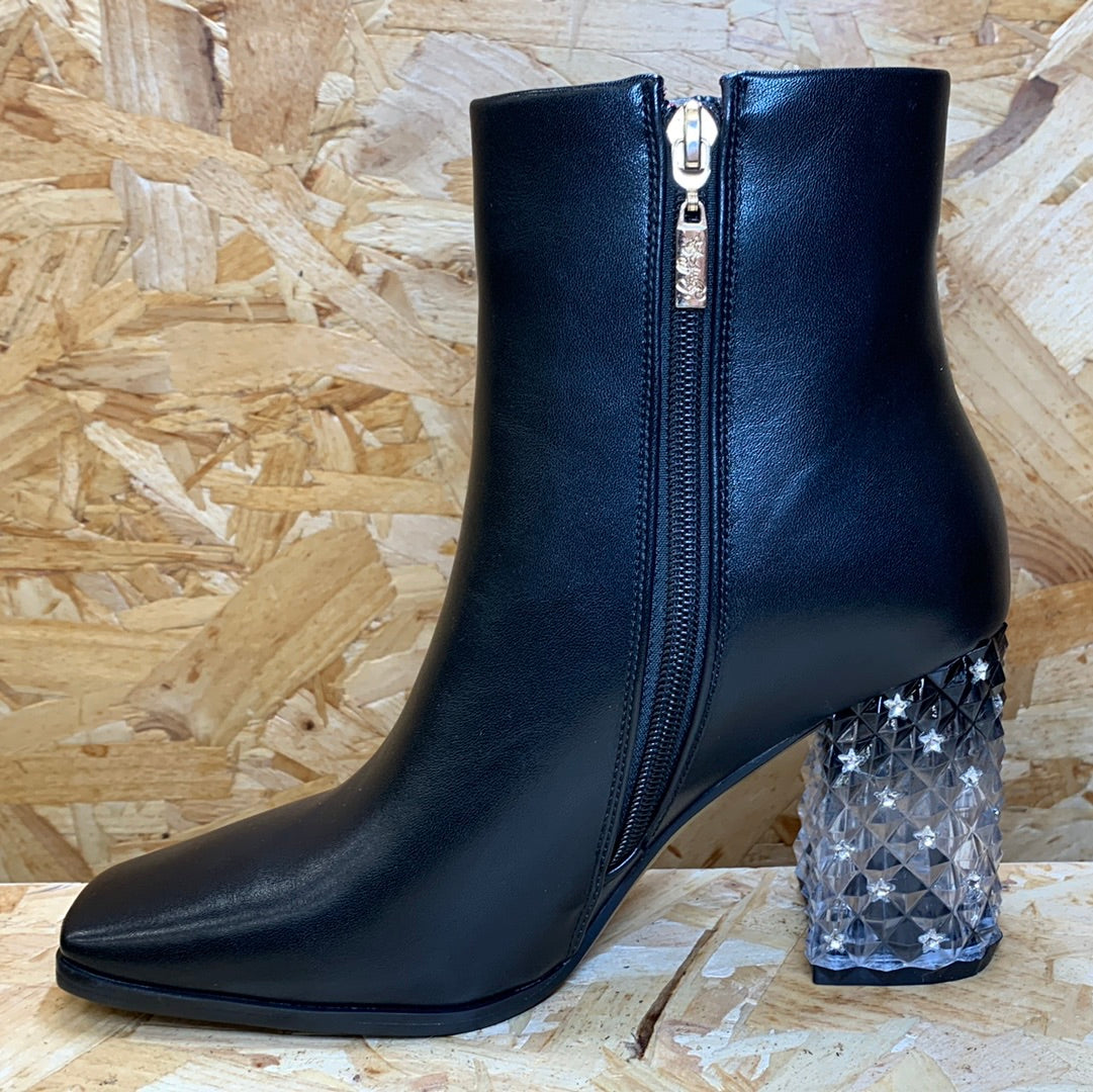 Kate Appleby Womens Ambleside in Black faux leather. Leather footbed. Side zip for ease of foot entry. Sleek clean design. Gold coloured sole. Clear block heel with small shining stars.