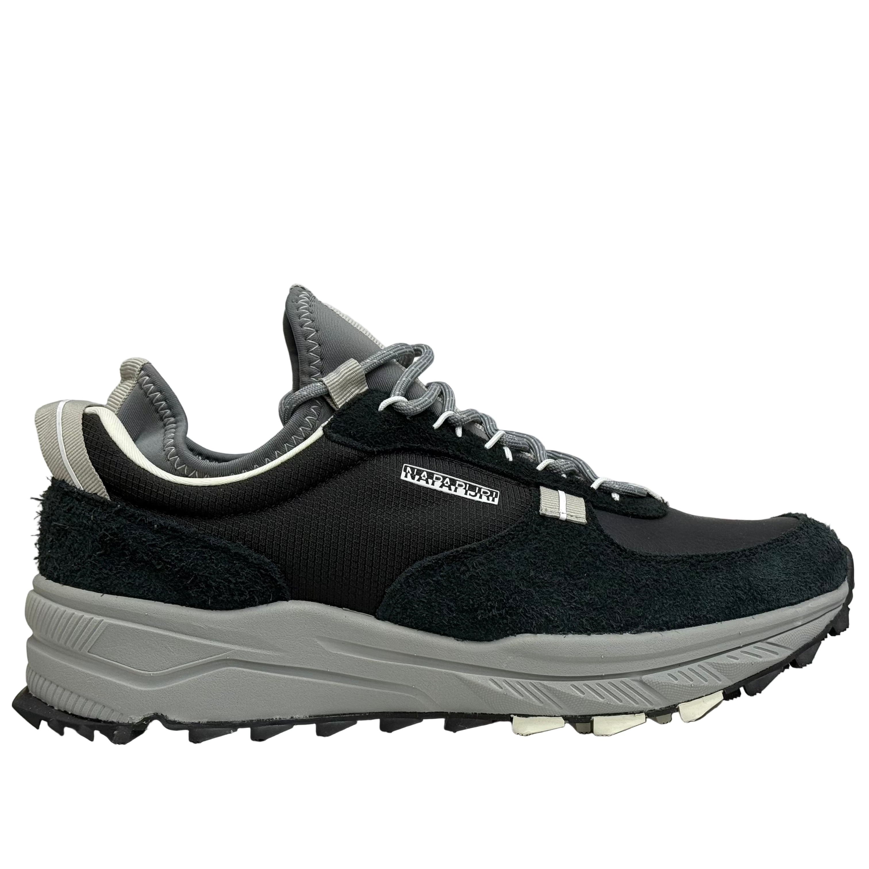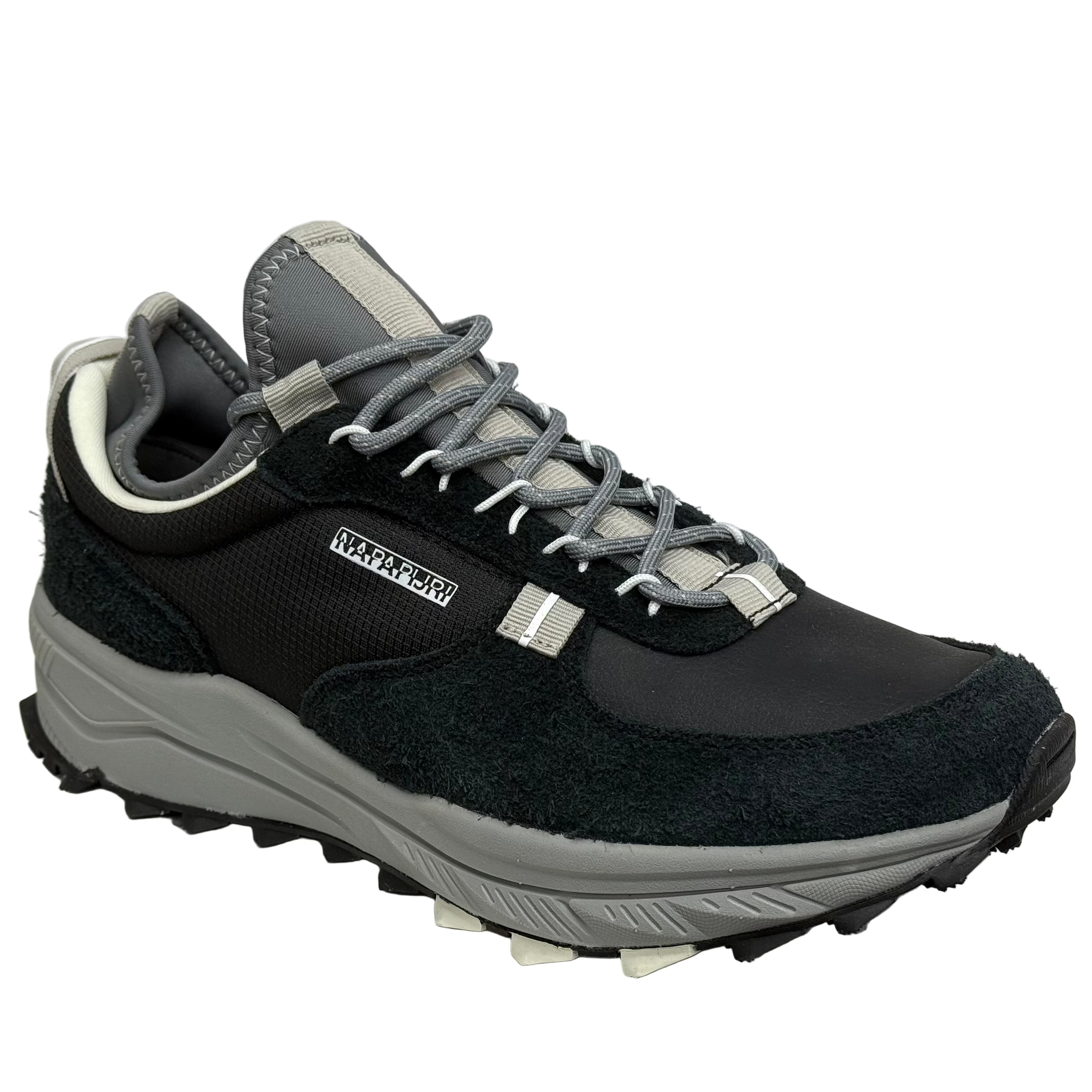 Trail-inspired sneakers with an urban attitude. Built with a durable upper in technical fabric and black suede, they feature a sock-like construction for easy, comfortable wear. Contrasting grey accents on the laces and heel add a refined touch, while the two-tone raised sole with a rugged tread delivers comfort and grip—perfect for everyday use.