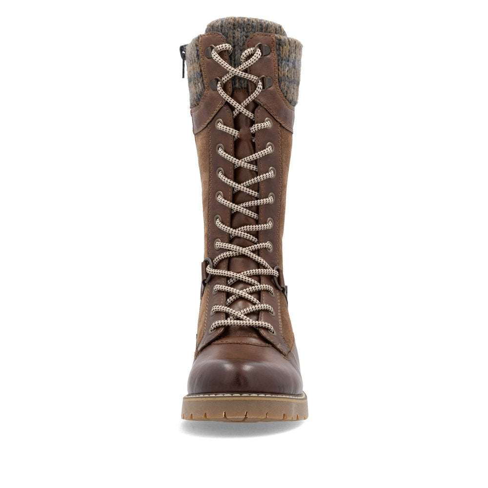 Compromise is not a solution! These brown remonte high boots made of suede leather will impress fashion-conscious women with their great features. The clever combination of lacing and zipper makes the shoe easy to put on and take off. The sole is flexible and grippy and ensures good traction at all times. Moreover, the comfort width offers your feet more freedom of movement in the forefoot area. This model is all about function times three: the water-repellent membrane keeps the feet dry, the fold-out spikes can be used for extra grip on icy floors and the insole with thermo function protects against the cold. Cozy and very warm virgin wool keeps the feet warm. Let's enjoy the cold days!