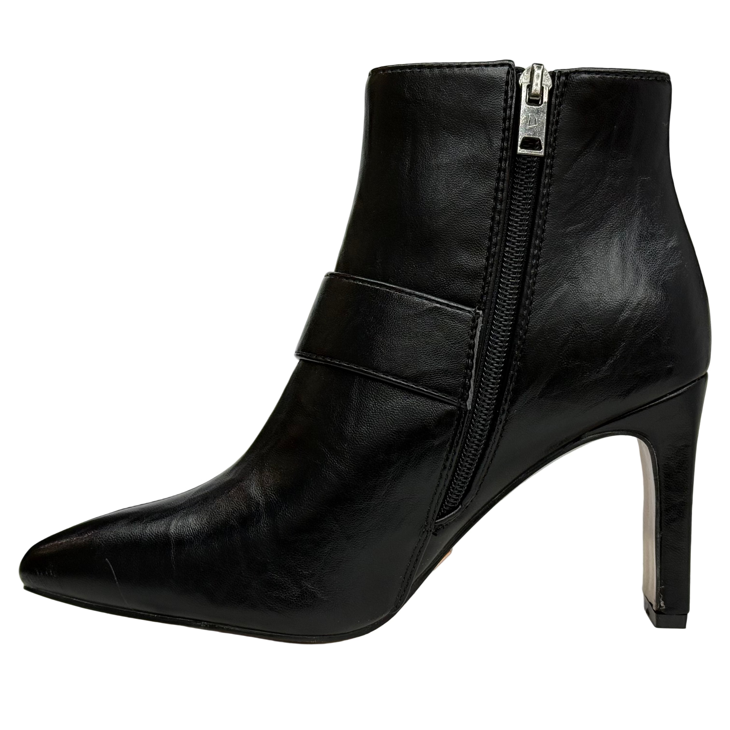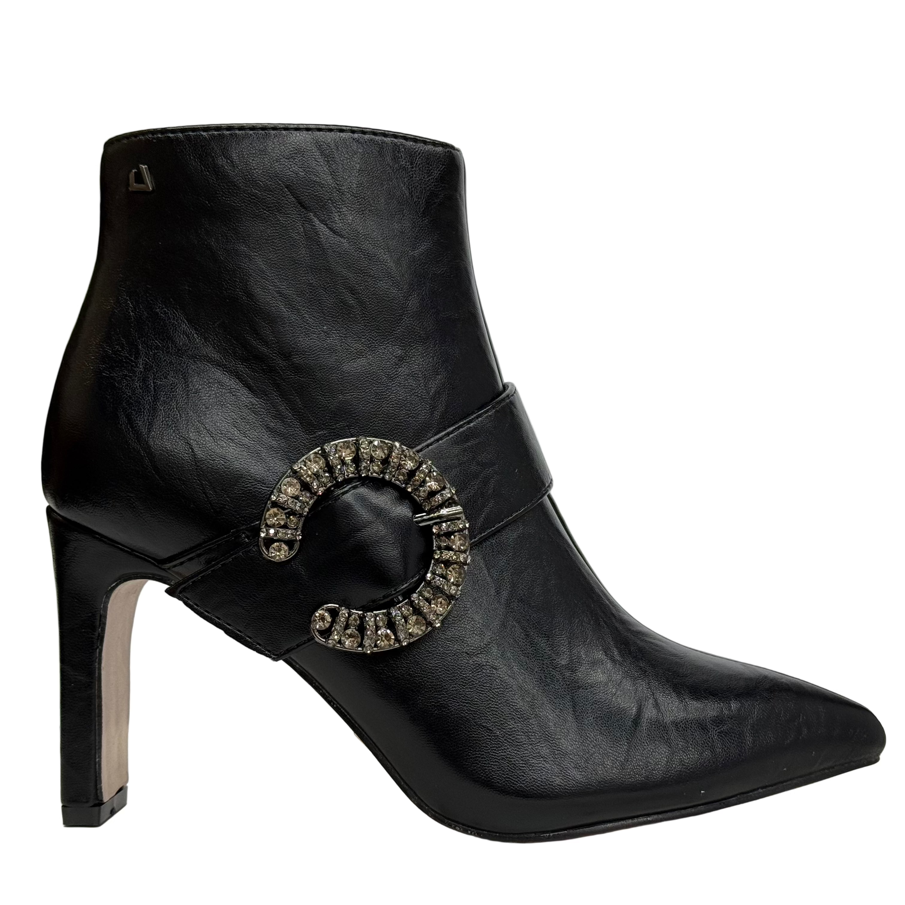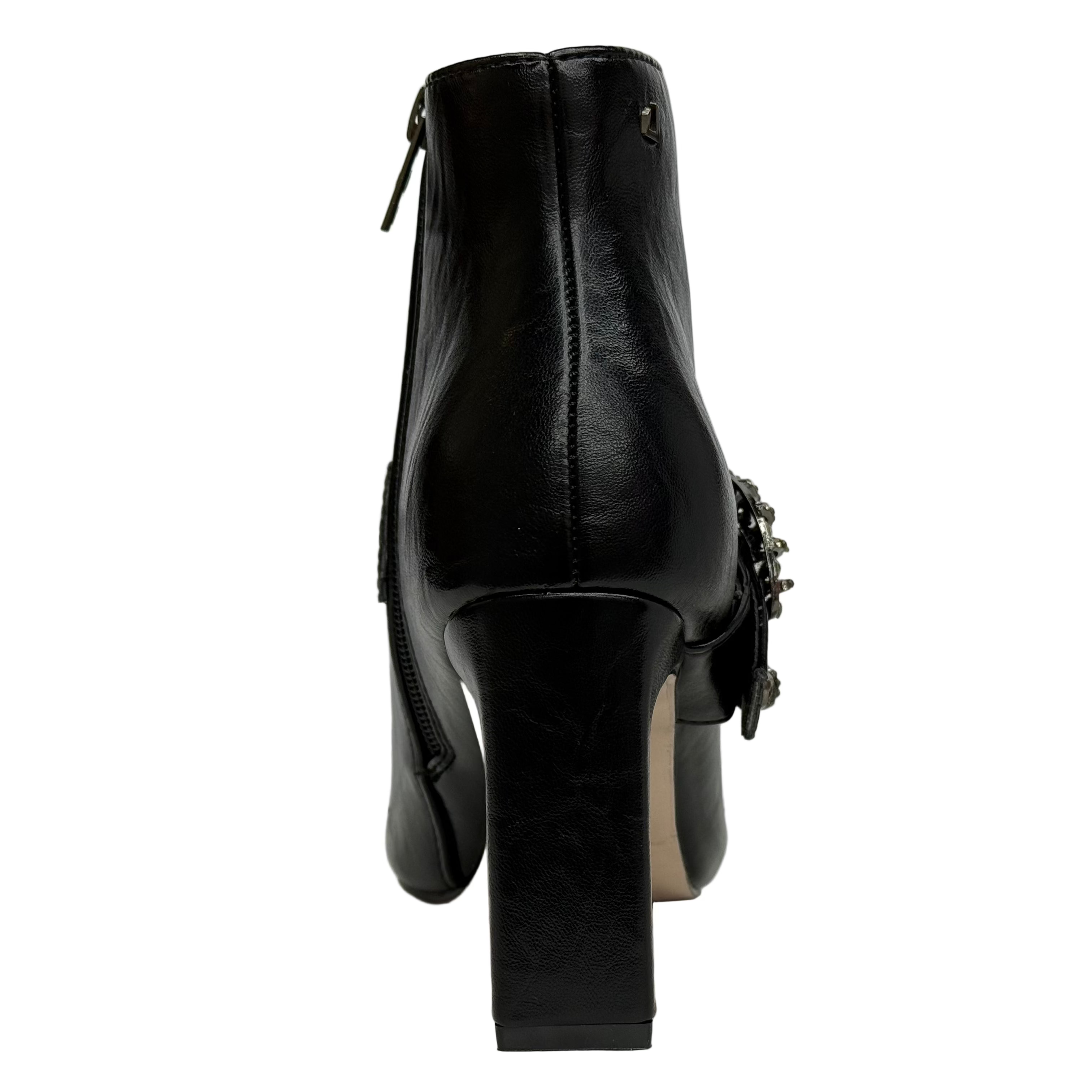 The Una Healy Women's Perfect Match Ankle Boot in sleek black faux leather. Featuring a handy side zip for quick slip-ons and a chic sculpted high heel, these boots add a playful twist with a faux buckle adorned in sparkling gems. Perfect for turning heads wherever you go!