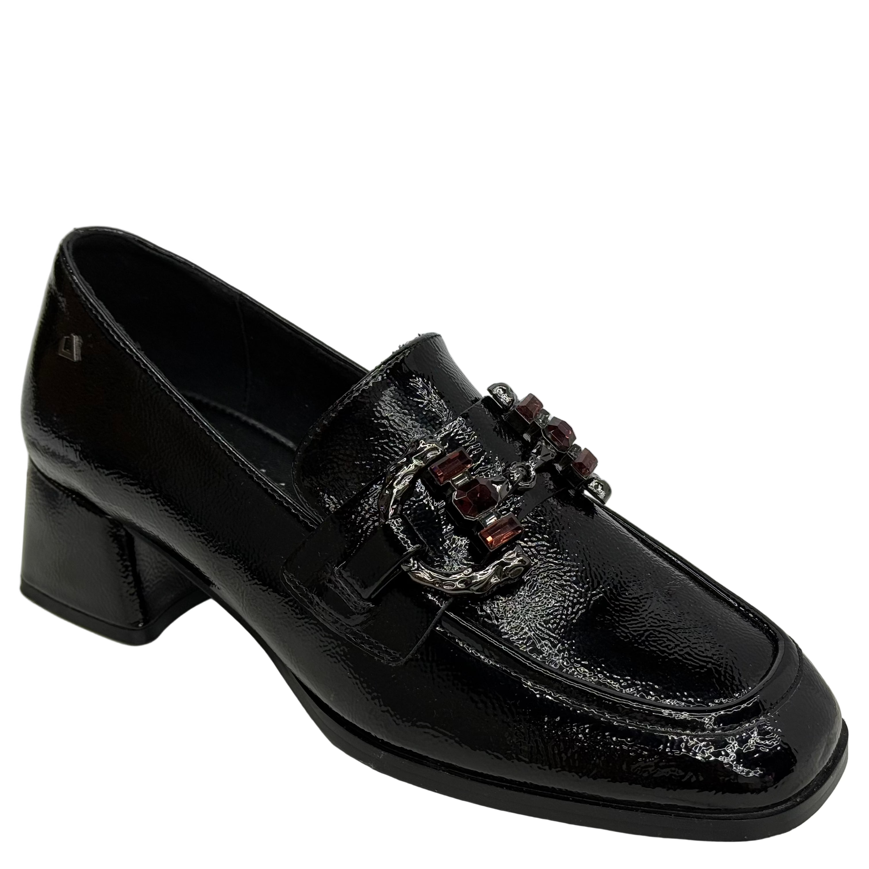 The Una Healy Women's Wagon Wheel Patent Shoe in sleek black. Featuring a faux leather upper and easy slip-on design, these shoes boast a low block heel and a quirky front buckle adorned with sparkling purple gems. A timeless classic with a fun, fashionable twist!